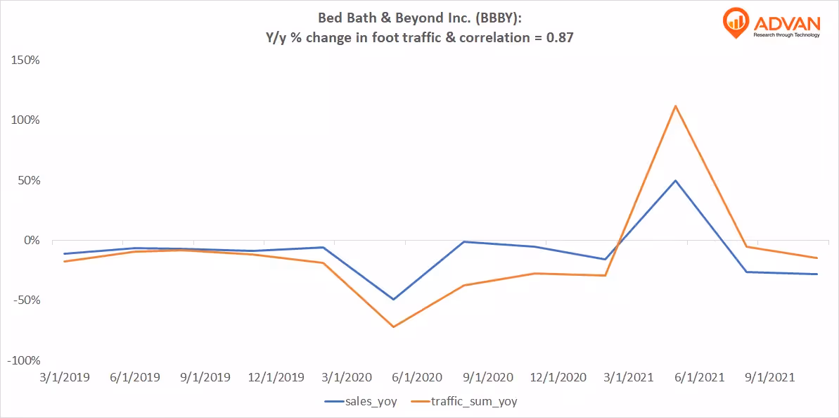 Notable Hit: (BBBY:NASDAQ) On Thursday January 6, 2022 Bed Bath & Beyond Inc. (BBBY) posted worse-than-expected revenues of $1.88bn missing the consensus estimate of $1.97bn or by -4.57% and in the same direction as Advan's forecasted sales. The revenue was down 28% YoY - Advan's foot traffic data captured a decrease in foot traffic of -15% YoY at its stores for fiscal Q3 2021. Advan's footfall data has a correlation of 0.87 on a YoY basis with BBBY's top-line revenue over the last 12 quarters.