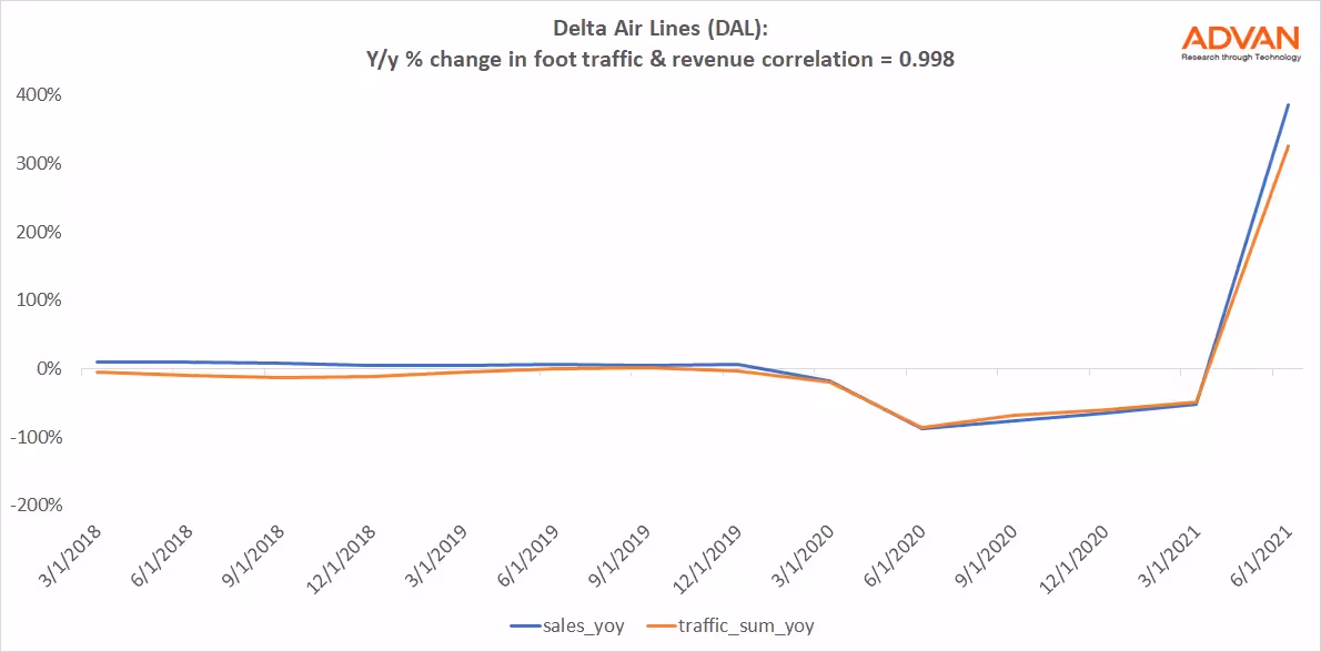 (DAL:NYSE) On Wednesday July 14, 2021 Delta Air Lines, Inc. (DAL) posted better-than-expected revenues of $7.13bn surpassing the consensus estimate of $6.1bn (-14.36%) and in the same direction as Advan's forecasted sales. The revenue was +385.42% YoY - Advan's foot traffic data captured an increase in traffic of +326.23% YoY at Terminals where Delta operates. Advan's footfall data has a correlation of 1.0 on a YoY basis with Delta's top-line revenue over the last 14 quarters.