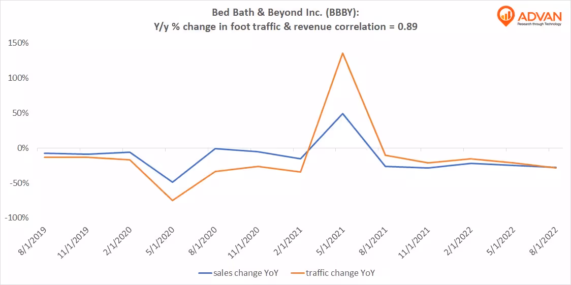 Notable Hit: (BBBY:NASDAQ) On Thursday September 29, 2022 Bed Bath & Beyond Inc. (BBBY) posted top line revenue of $1.437bn missing the consensus estimate by -5.5% and in the same direction as Advan's forecasted sales. The revenue declined 27.6% YoY and in line with Advan's foot traffic data decrease of 28.8% YoY at its stores for fiscal Q2 2022. Advan's footfall data has a correlation of 0.89 on a YoY basis with BBBY's top-line revenue over the last 14 quarters.