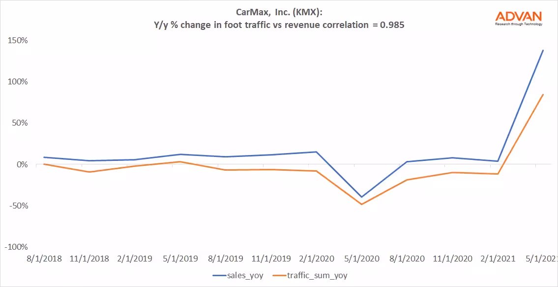 Notable Hit: (KMX:NYSE) On Friday June 25, 2021 CarMax, Inc. (KMX) posted better-than-expected revenues of $7.7bn surpassing the consensus estimate of $6.11mm (-26%) and in the same direction as Advan's forecasted sales. The revenue was +138.4% YoY - Advan's foot traffic data captured an increase in traffic of +84.77% YoY. As a result, the stock was +6.3% in the pre-market from its previous close price at $119.43. Advan's footfall data has over 0.98 correlation on a YoY basis with Carmax's top-line revenue over the last 12 quarters.