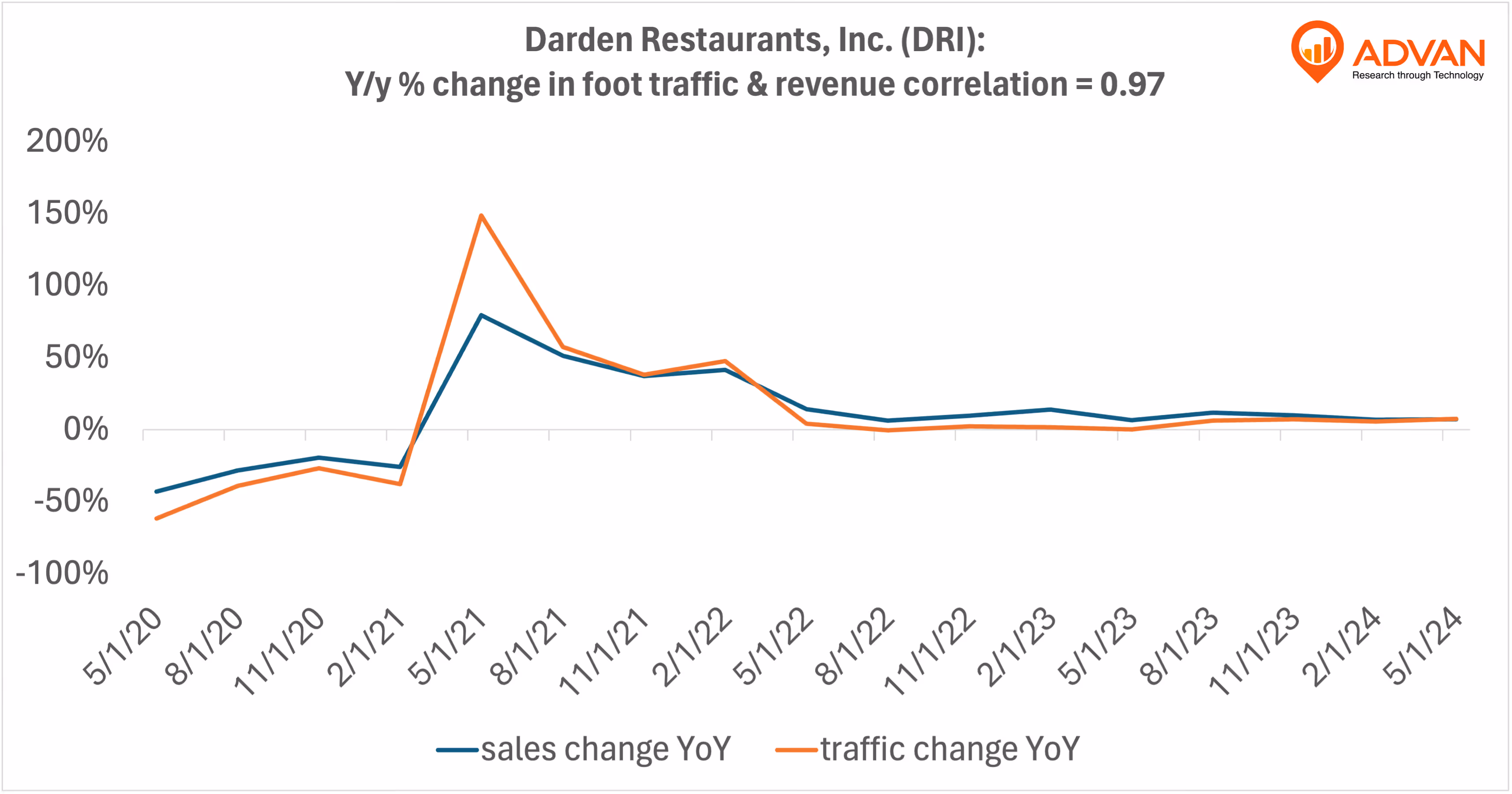 Notable Hit 1: (DRI:NYSE) On Thursday June 20, 2024 Darden Restaurants, Inc. (DRI) posted revenues of $2.96 bn slightly missing the analysts estimate by 0.6% and in the same direction as Advan's forecasted sales. Advan's data showed a 7.3% increase YoY in foot traffic to its restaurants (subsidiaries included) in Q1 2024; the company's revenue increased 6.8% YoY. As a result, the stock opened up 3.6% from previous close. Advan's footfall data has a correlation of 0.97 on a YoY basis with DRI's top-line revenue over the last 17 quarters.