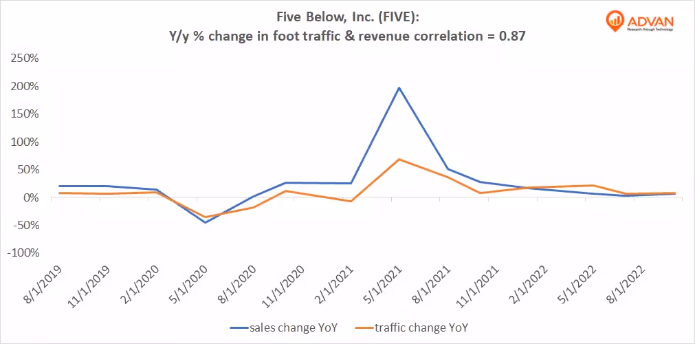 Notable Hit: (FIVE:NASDAQ) On Wednesday November 30, 2022 Five Below, Inc. (FIVE) posted revenues of $645.03mm beating the consensus estimate by +5.7% and in the same direction as Advan's forecasted sales. The revenue increased 6.15% YoY - in line with Advan's foot traffic data increase of 7.76% YoY across all of the retailer's stores for Q3 2022. Advan's footfall data has a correlation of 0.87 on a YoY basis with FIVE's top-line revenue over the last 14 quarters.