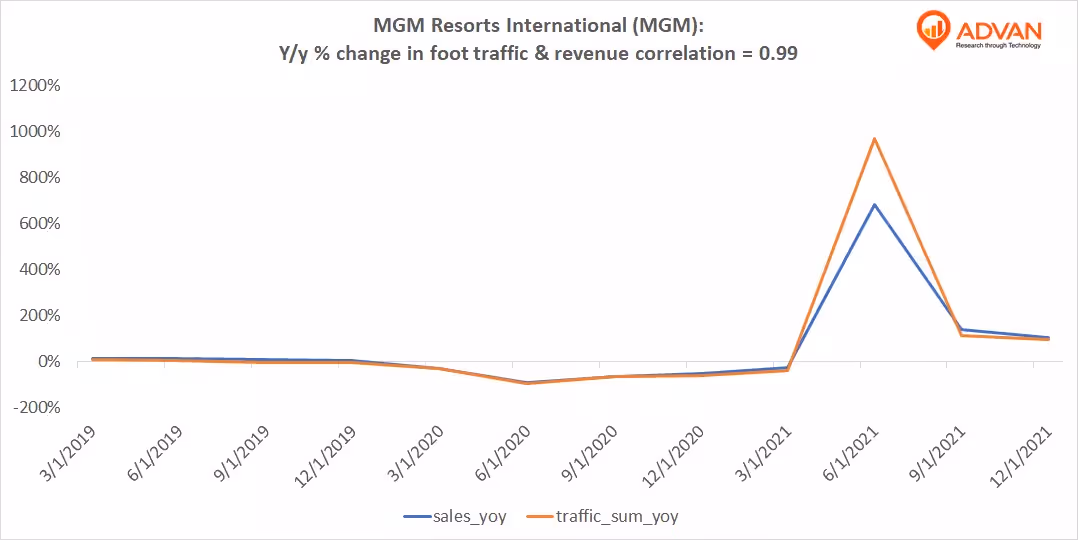 Notable Hit: (MGM:NYSE) On Wednesday February 9, 2022 MGM Resorts International (MGM) posted better-than-expected revenues of $3.057bn surpassing the consensus estimate of $2.79bn or by +9.6% and in the same direction as Advan's forecasted sales. The revenue was up 105% YoY - Advan's foot traffic data captured an increase in foot traffic of +98% YoY at its US resorts and casinos for Q4 2021. As a result of beating the sales and EPS, the stock closed at $48.52, up +2.8% from previous close. Advan's footfall data has a correlation of 0.99 on a YoY basis with MGM's top-line revenue over the last 12 quarters.