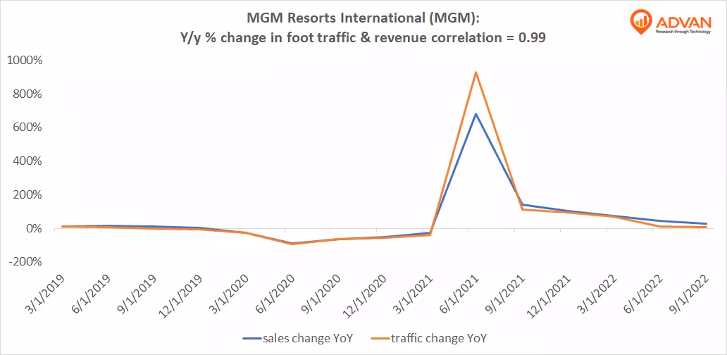 Notable Hit: (MGM:NYSE) On Wednesday November 2, 2022 MGM Resorts International (MGM) posted revenues of $3.42bn surpassing the consensus estimate by +5% and in the same direction as Advan's forecasted sales. The revenue increased 26% YoY and in line with Advan's foot traffic data increase of 8% YoY at its resorts for Q3 2022. Advan's footfall data has a correlation of 0.99 on a YoY basis with MGM's top-line revenue over the last 15 quarters.