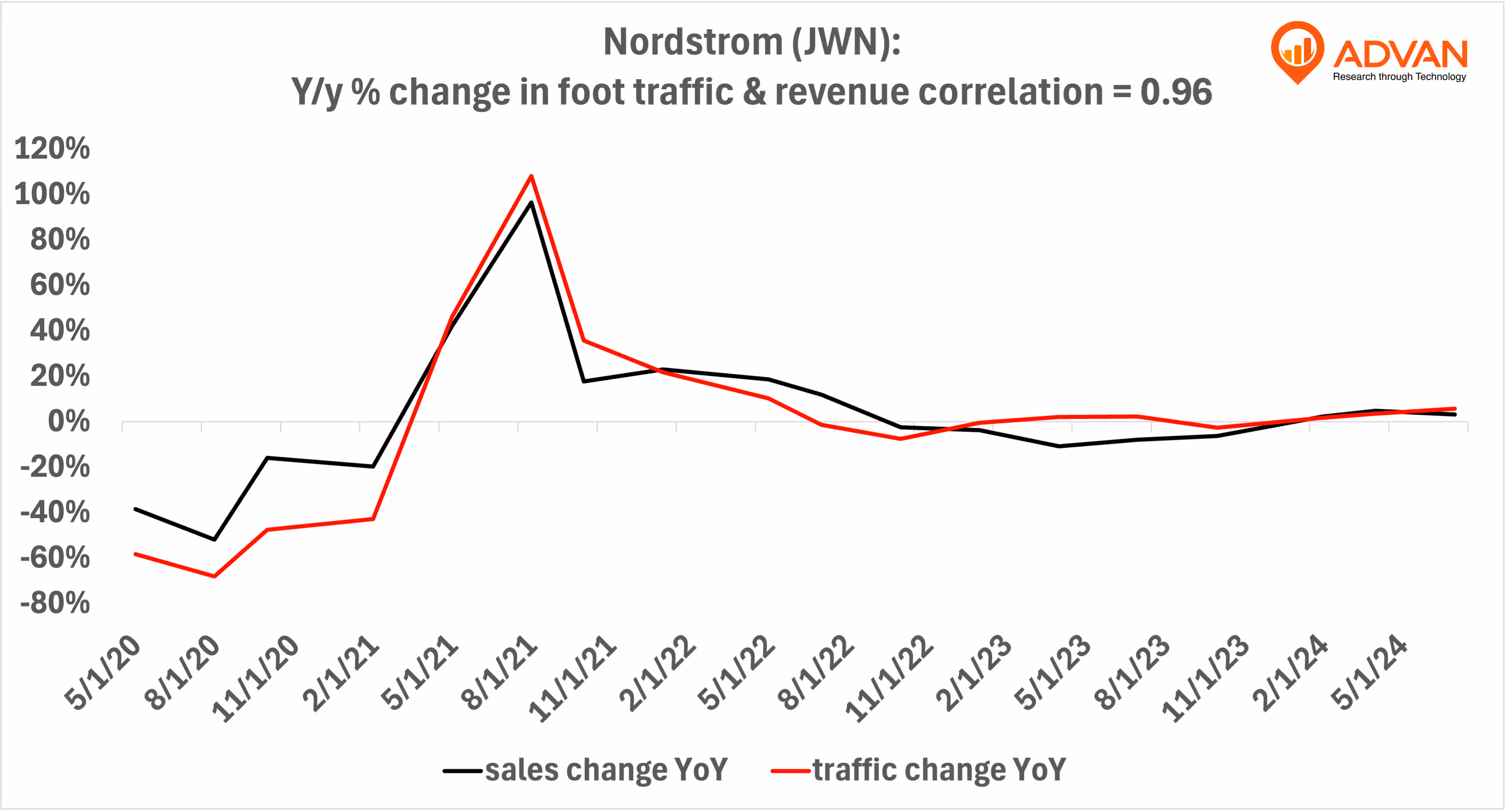 Notable Hit 1: (JWN:NYSE) On Tuesday August 27, 2024 Nordstrom, Inc. (JWN) posted revenues of $3.89 bn surpassing the analysts estimate by 0.4% and in the same direction as Advan's forecasted sales. Advan's data showed a 5.7% increase YoY in foot traffic to its stores in Q2 2024; the company's revenue increased 3.1% YoY. As a result, the stock next day was +9% from previous close. Advan's footfall data has a correlation of 0.96 on a YoY basis with JWN's top-line revenue over the last 18 quarters.