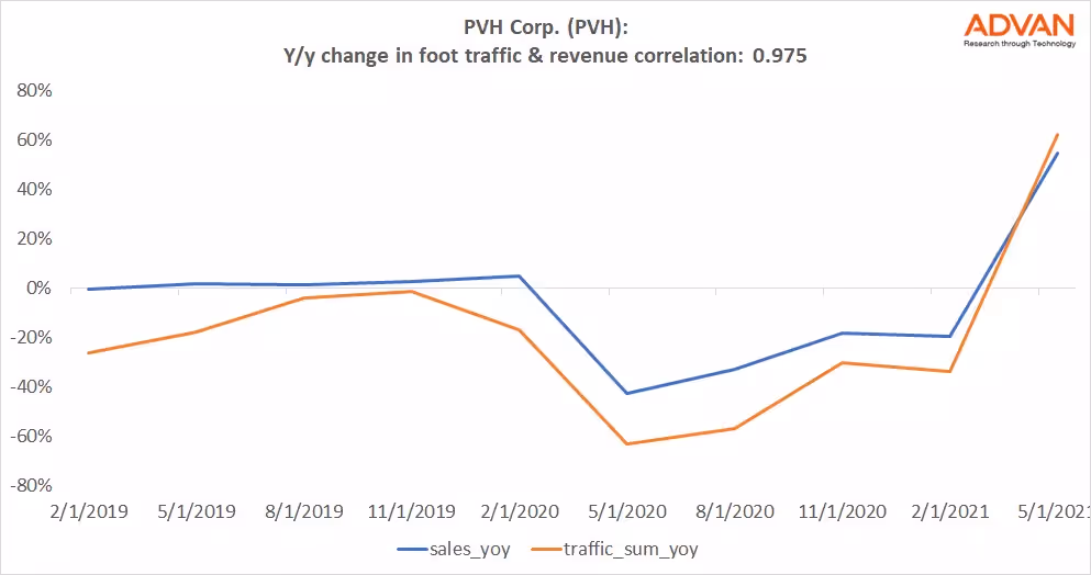 (PVH:NYSE) On Thursday June 3, 2021 PVH Corp. (PVH) posted better-than-expected revenues of $2.08bn surpassing the consensus estimate of $1.93 (-7.32%) and in the same direction as Advan's forecasted sales. The revenue was up (+54.71%) YoY - Advan's foot traffic data captured an increase in traffic of (+62.1%) YoY. Advan's footfall data has over 0.97 correlation on a YoY basis with PVH's top-line revenue over the last 10 quarters.