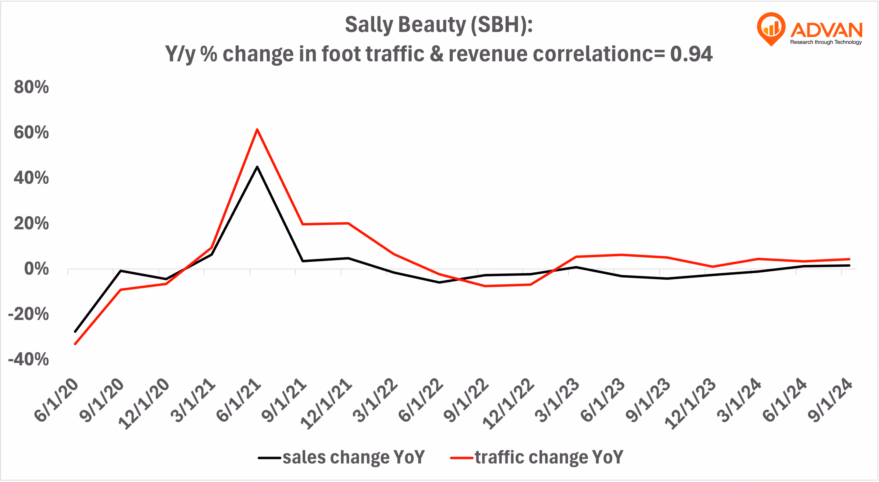 Notable Hit 1: (SBH:NYSE) On Thursday November 14, 2024 Sally Beauty (SBH) posted revenues of $935.03 mm meeting the analysts estimates and in the same direction as Advan's forecasted sales. Advan's data showed a 4.3% increase YoY in foot traffic to its stores in Q3 2024; the company's revenue increased 1.5% YoY. The stock up 12% from previous close. Advan's footfall data has a correlation of 0.94 on a YoY basis with SBH's top-line revenue over the last 19 quarters.