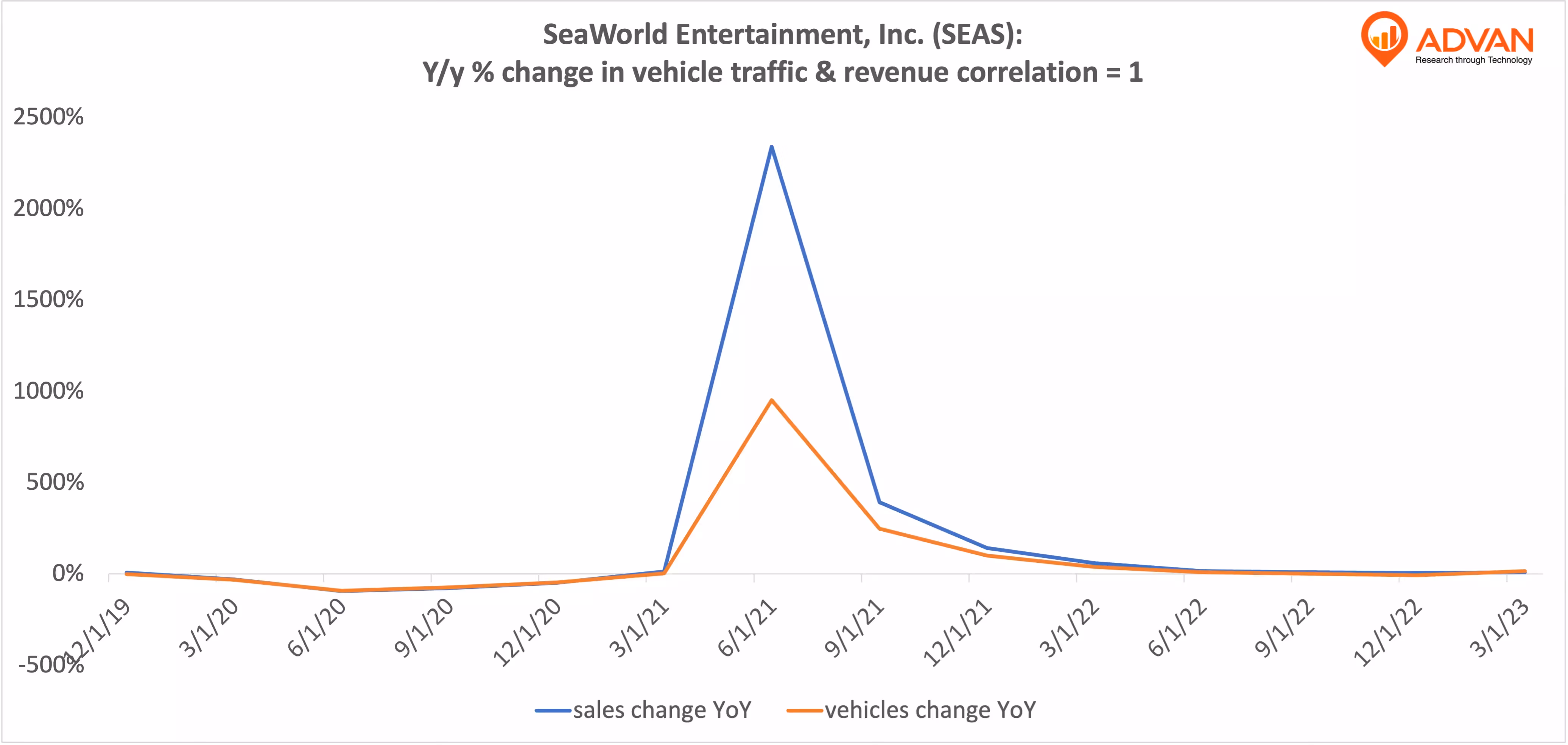 Notable Hit 1: (SEAS:NYSE) On Tuesday May 9, 2023 SeaWorld Entertainment, Inc. (SEAS) posted revenues of $293.35 mm. beating the mean analyst estimates by 3.7% and in the same direction as Advan's forecasted sales. The revenue was up 8.4% YoY - in line with Advan's vehicle traffic data increase of 14.8% YoY at its amusement parks in Q1 2023. The stock closed up 5.7% from previous close. Advan's vehicle data has a correlation of 1 on a YoY basis with SEAS's top-line revenue over the last 12 quarters.