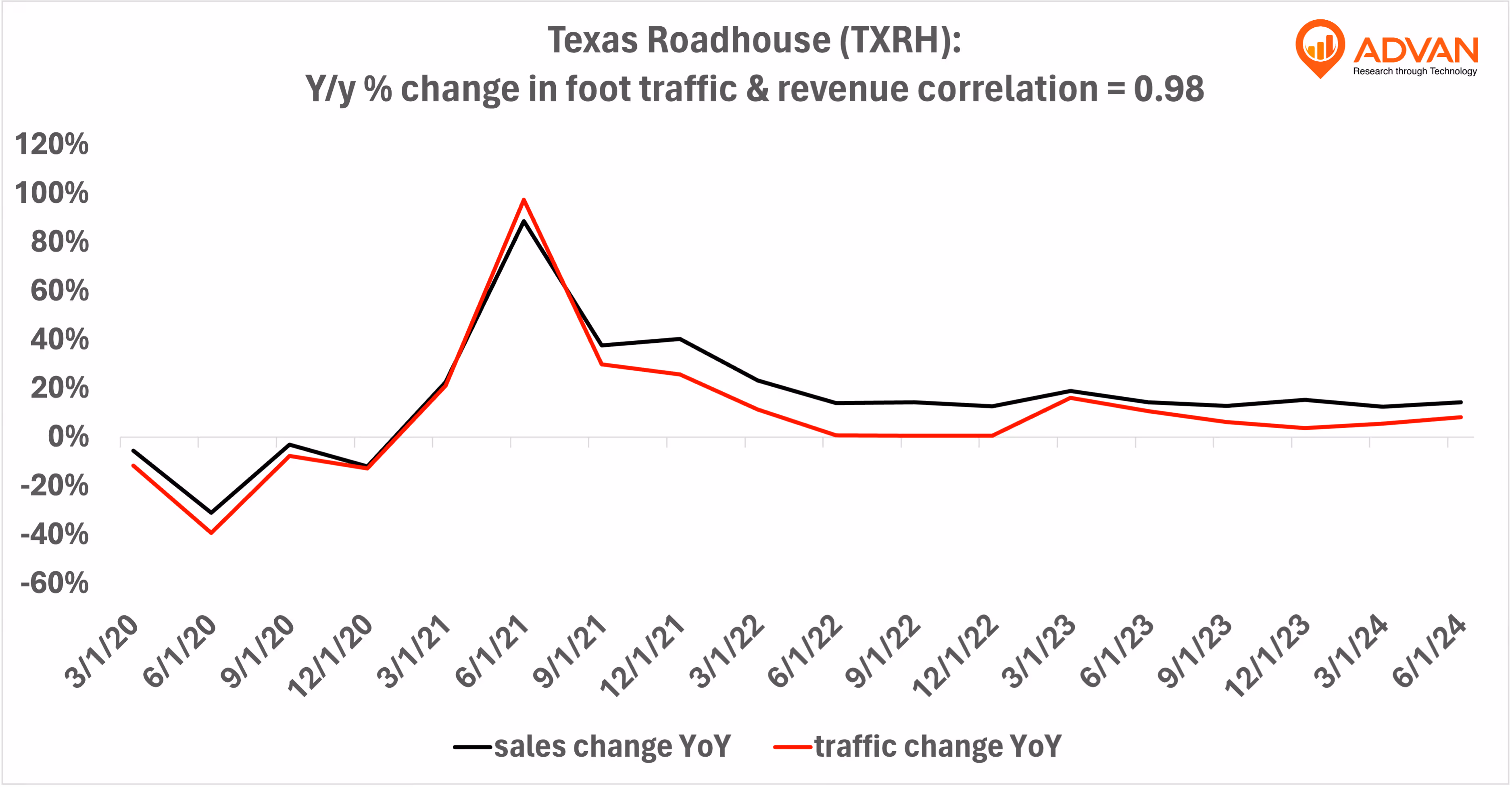 Notable Hit 1: (TXRH:NASDAQ) On Thursday July 25, 2024 Texas Roadhouse, Inc. (TXRH) posted revenues of $1.34 bn surpassing the analysts estimate by 10% and in the same direction as Advan's forecasted sales. Advan's data showed a 8.2% increase YoY in foot traffic at its restaurants in Q2 2024; the company's revenue increased 14.4% YoY. The stock next day opened +5.4% from previous close. Advan's footfall data has a correlation of 0.98 on a YoY basis with TXRH's top-line revenue over the last 18 quarters.