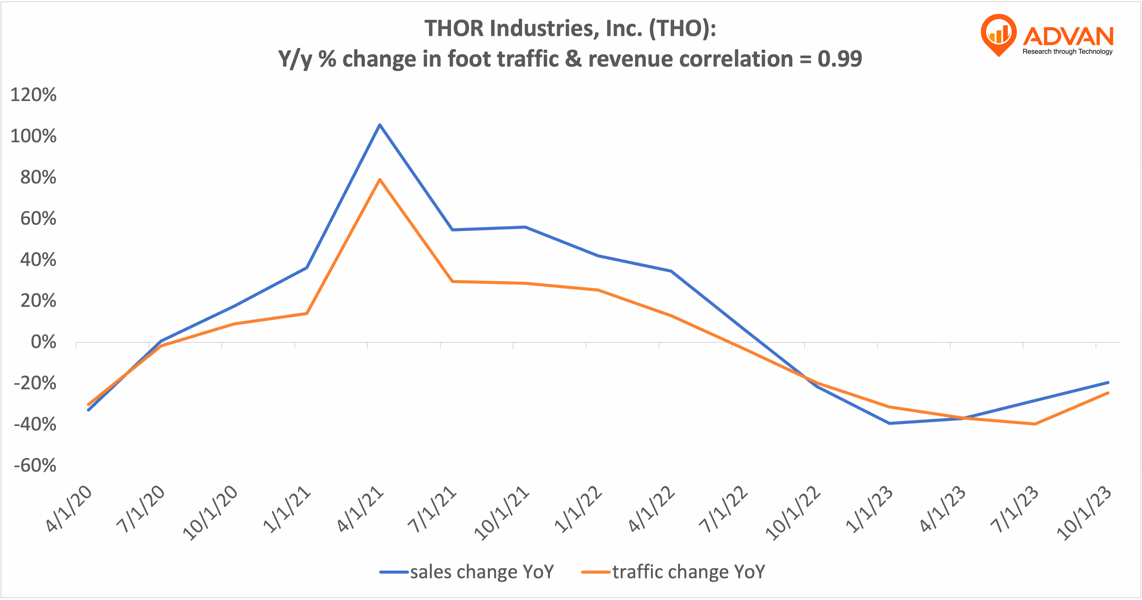 Notable Hit 1: (THO:NYSE) On Wednesday December 6, 2023 THOR Industries, Inc. (THO) posted revenues of $2.5 bn missing the mean analyst estimate of $2.55 bn and in the same direction as Advan's forecasted sales. The revenue decreased 19.5% YoY inline with Advan's foot traffic data decrease of 24.6% YoY at its manufacturing facilities in Q1 2024 fiscal. Advan's footfall data has a correlation of 0.99 on a YoY basis with THO's top-line revenue over the last 14 quarters.