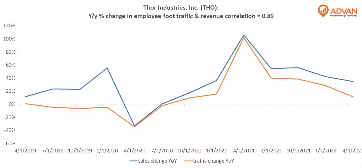 Notable Hit: (THO:NYSE) On Wednesday June 8, 2022 Thor Industries, Inc. (THO) posted better than expected revenues of $4.66bn surpassing the consensus estimate of $4.16bn or by +12% and in the same direction as Advan's forecasted sales. The revenue was up 34.6% YoY and in line with Advan's employee foot traffic data increase of 12% YoY at its factories for Q3 fiscal. As a result of beating sales and EPS the stock opened +1.6% from previous close. Advan's footfall data has a correlation of 0.89 on a YoY basis with THO's top-line revenue over the last 13 quarters.
