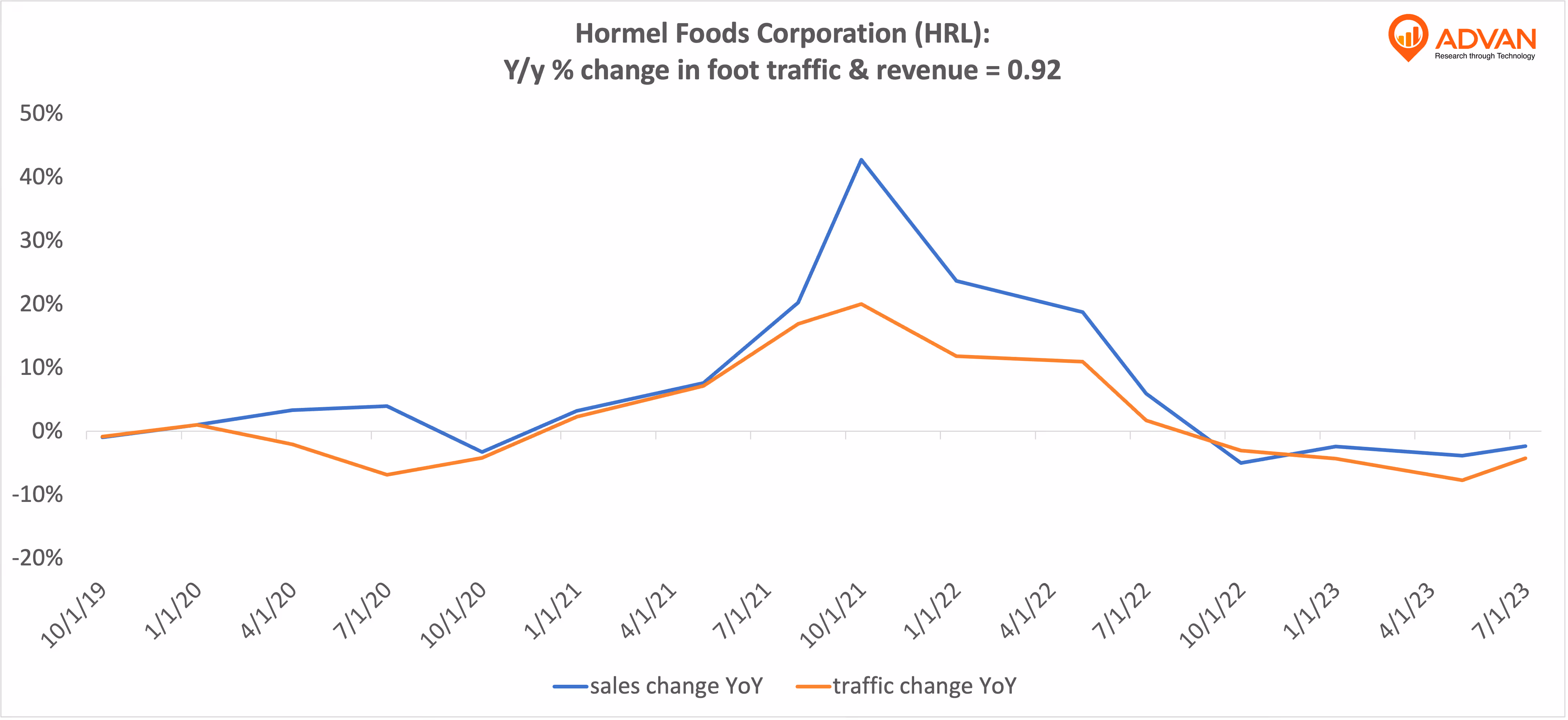 Notable Hit 1: (HRL:NYSE) On Thursday August 31, 2023 Hormel Foods Corporation (HRL) posted revenues of $2.963 bn missing the mean analyst estimates of $3.07 bn and in the same direction as Advan's forecasted sales. The revenue decreased 2.3% YoY- following Advan's foot traffic data decrease of 4.3% YoY at its production facilities in Q2 2023 fiscal. As a result the stock closed down 2.7% from previous close. Advan's footfall data has a correlation of 0.92 on a YoY basis with HRL's top-line revenue over the last 16 quarters.