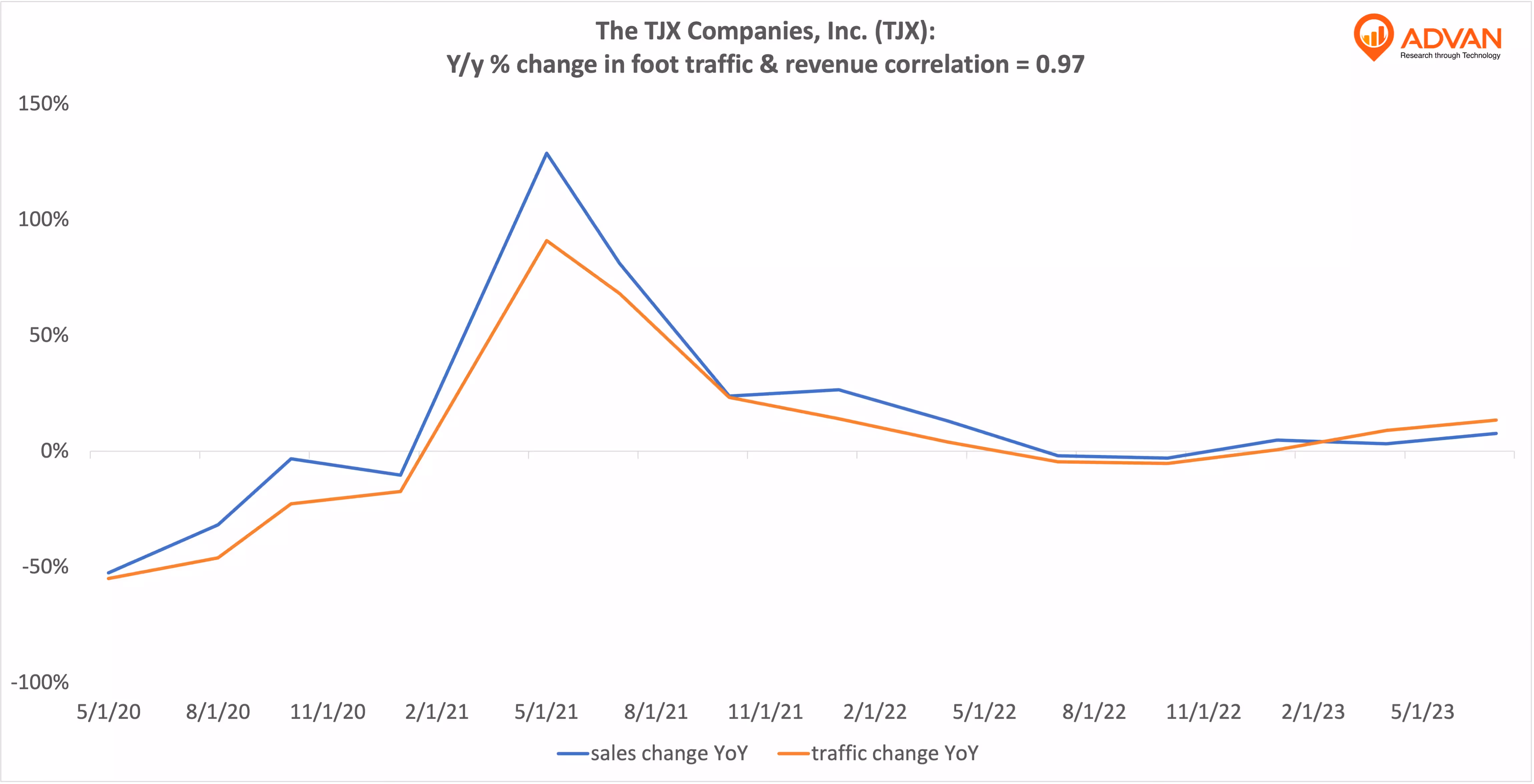 Notable Hit 1: (TJX:NYSE) On Wednesday August 16, 2023 The TJX Companies, Inc. (TJX) posted revenues of $12.76 bn beating the mean analyst estimates of $12.39 bn and in the same direction as Advan's forecasted sales. The revenue increased 7.7% YoY - following Advan's foot traffic data increase of 13.4% YoY across all of its stores in Q2 2023. Advan's footfall data have a correlation of 0.97 on a YoY basis with TJX's top-line revenue over the last 14 quarters.