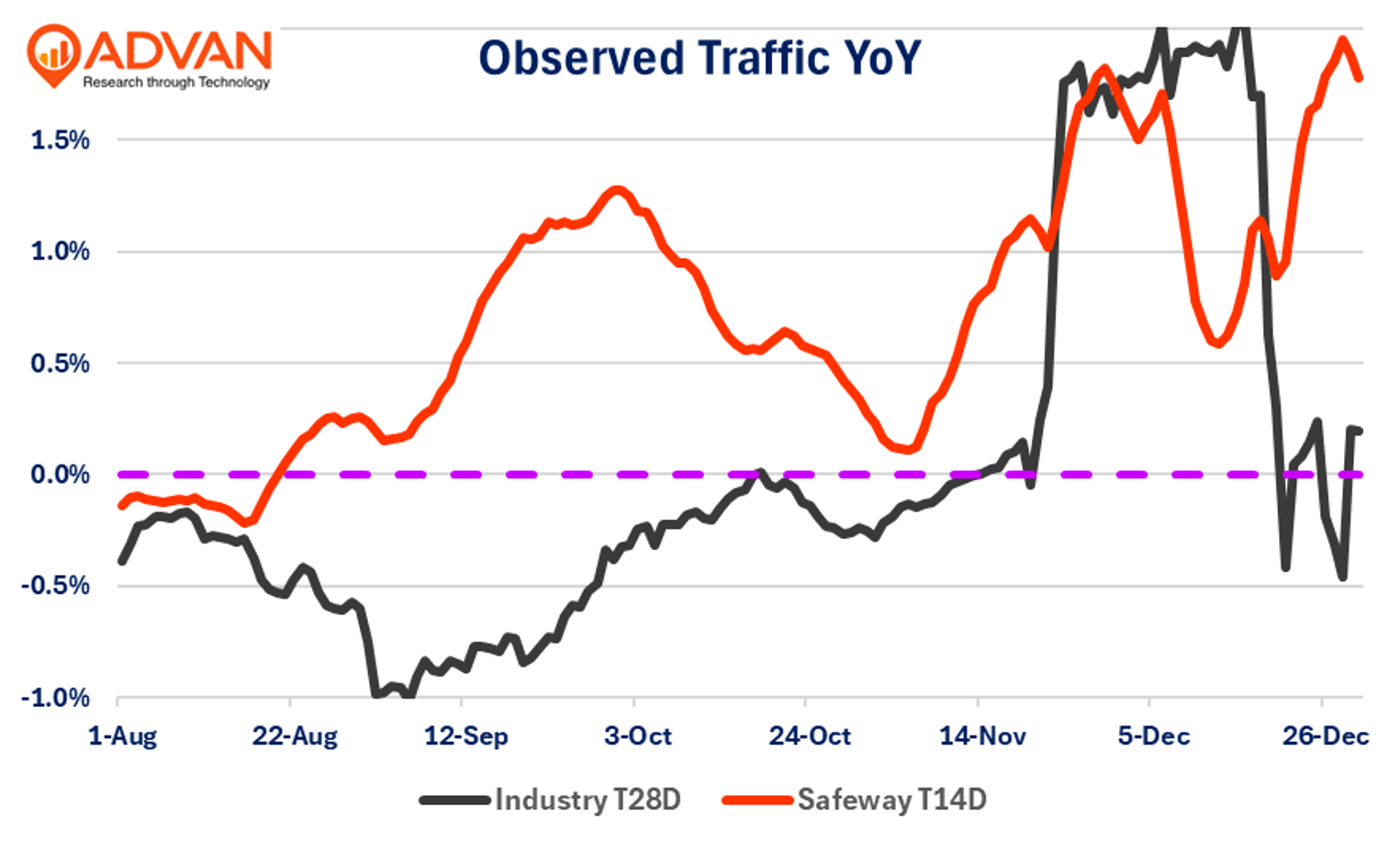 Albertsons fiscal Q3 sales (November-end) comp-sales (+2.4%) were driven by thin margin categories, which combined with price-investments resulted in a -55bps decline in the gross margin rate. The +2.4% represents +$430M in $-sales; the largest drivers were growth in pharmacy sales (+$465M), which was principally GLP-1 drugs, and 3P store delivery + curbside (+$257M). Said differently, inside-the-store grocery $-sales fell -1.9%, -90bps worse QoQ. (Management pegged an impact of -15bps from the government shutdown and delayed SNAP.) For reference, the industry grew at a +3% rate (CB MRTS) during September / October, i.e. Albertsons lost $-share. That said, Safeway (ACI’s largest banner) outperformed the industry in traffic, and so why not also $-s, what gives?