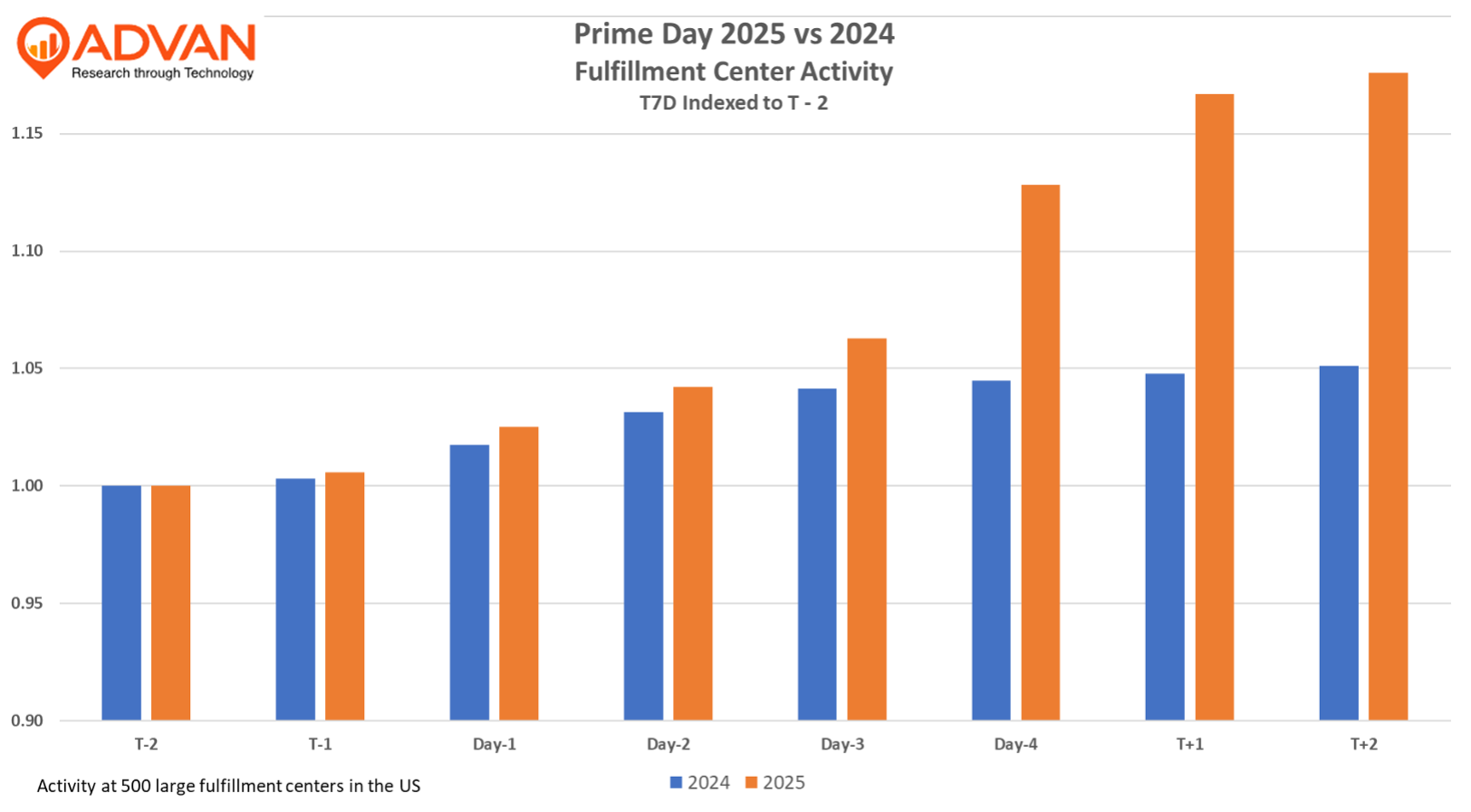 The chart below shows trailing 7-day visits to 500 large Amazon fulfillment centers in the US, indexed to two days prior to the event in 2024 and 2025. Obviously, it’s the days trailing the event that are the busiest, given that’s when the orders are packed and put into delivery-station trucks. As such, it’s 2025’s large increases in Day-4, T+1, and T+2 that are really impressive. Why such a consumer response? We think that it reflects our Thrifty K-Shaped economy (a frequent topic of ours) and Amazon’s ability to put really good deals in front of its Prime members.