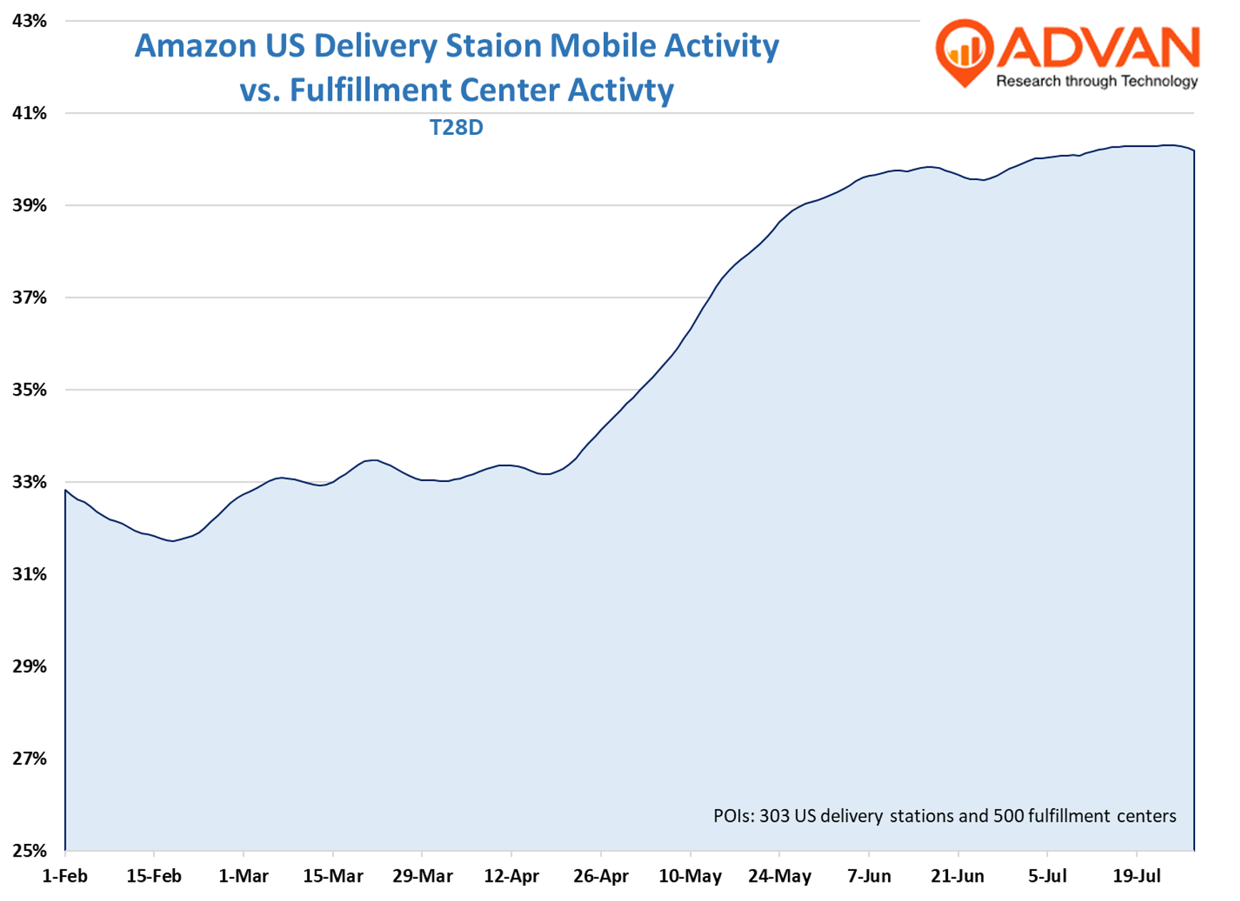 If the US business segment wasn’t burdened with “moonshot” start-up businesses like Project Kuiper, as well as all of the G&A functions for Amazon Inc., the US segment margins would be mid-teens. Two of the largest expense lines are fulfillment and shipping. Shipping expenses increased only 6% YoY, much lower than the unit growth of 12%, leading to a rate improvement of 103 bps (vs. retail sales revenue, or 1P+3P). Fulfillment expense improved by 22 bps. Automation, route optimization, order frequency, etc. all help drive improvement in these figures. Additionally, inventory placement through using more regional delivery / sortation stations to get closer to the customer continues to be a large contributor, and is shown most clearly in the improvement in shipping expense. Below, we show how this looks in our data, with delivery station geolocation data over fulfillment center data. More automation at the fulfillment centers is also a contributor to reducing the denominator and increasing the ratio.