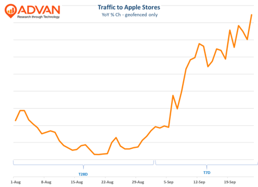 Today we looked at observed traffic to Apple’s geofenced stores (that’s locations that are street facing single level). As shown, the upcoming release of the Air (September 19th) was already driving increased traffic even before becoming available, and since available, an additional bump in traffic. As a reminder, the iPhone 16 came out last September. Given the enthusiasm and the broadly favourable product reviews (and for the Watch and AirPods), we expect this Christmas to be Apple dominated, and given that consumers are still being tight with their spending, that may cause other categories of gifts (and retailers) to be challenged as has happened in the past.