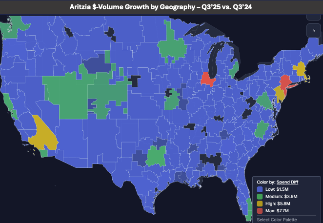 Last week, we presented our learnings on this year’s holiday season to Morgan Stanley’s institutional investor clients. In that, we highlighted Walmart, Dick’s Sporting Goods, Five Below, Ross, and specialty brands American Eagle, Gap, and Aritzia as having a very strong season. On Friday, Aritzia reported fiscal Q3 results (November period end), and yes, FQ3 and holiday results were very strong. Revenue growth for the US region accelerated 14 ppts QoQ to +54% YoY. Management guided to FQ4 revenue growth of “high-teens” with the implied outlook for the US to be in the 20s. That’s conservative; as shown below, observed spend for December was in the 50% range and December represents over 50% of fiscal Q4. Where is Aritzia growing?