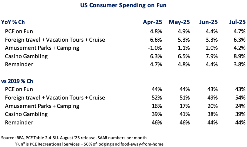 Well for the non-Disney-s and -Universals of theme parks, the season ended on a soft note. Disney’s marketing machine and the new Universal Epic Universe park had just too much of a pull. Separately, given our “thrifty K-shaped consumer-economy” cruise as a better value continues to take market share (third season in a row). The way we track market share is shown in the table. Personal Consumption Expenditures on “Fun” has outpaced Amusement Parks + Camping spending each month of the summer. By contrast, except for June, Foreign Travel + Vacation Tours + Cruise has outpaced Fun. Versus 2019, Foreign Travel + Vacation Tours + Cruise is up over 50%, whereas, Amusement Parks + Camping, only 24%. Note that the level to ’19 for Amusement Parks has grown since May; that’s do to better performance in the Summer of ’21 – a period when the industry boomed as Foreign Travel + Vacation Tours + Cruise were still in the Covid-bunker.