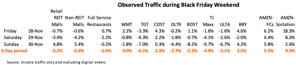 · Black Friday Weekend traffic was softer YoY due to adverse weather, a softer weekend box office, aggressive online promotions, and potentially a strong Saturday college football schedule that kept folks on their couches for the day. (They sprang into shopping malls on Sunday).