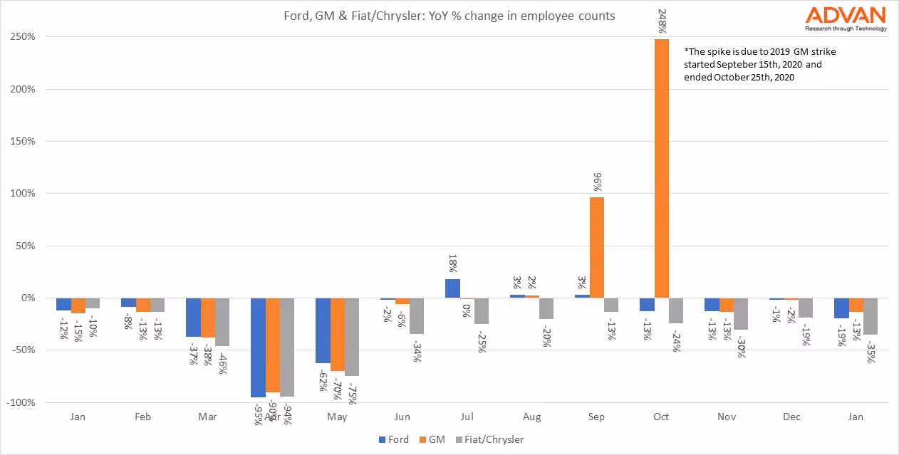 We looked at the data at the US plants for the 3 carmakers. In January, Fiat/Chrysler employee counts were down 35% year over year while at Ford’s and GM’s factories down 19% and 13% respectively.