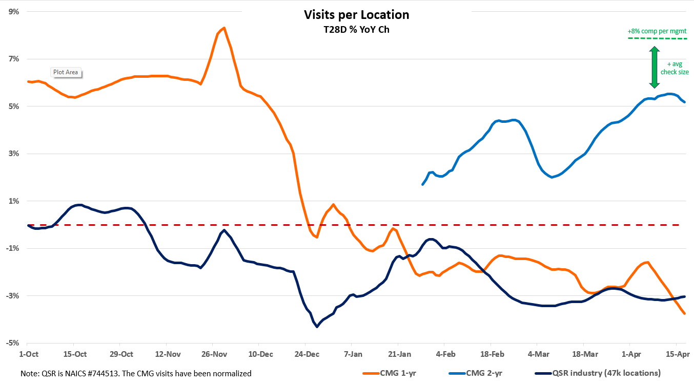 As shown in the chart above, Chipotle's deceleration is more severe than the broader industry slowdown. That also shows in the 2- and 3-yr comp transaction CAGRs shown in the table below. (Yes, management is pushing down expectations for the Q2 comp to be around a -2.5% decline.) The difference between Chipotle and the industry may reflect a sharper pull back by the less affluent that are burnt out on inflation which is less severe for lower-priced QSR brands such as McDonald’s; McDonald’s traffic (per Advan) has not experienced a negative inflection and has been running around flat YoY. The difference could also imply more encroachment by competitors, something that we will be looking into in the weeks to come. On the call, CEO Scott Boatwright said, “We took a hard look at the consumer by income cohort, which we're not seeing any divergence in any cohort, specific cohort, and we took a look at it by geography. And we see that the slowdown is more macro versus generalized or by geography or by cohort. So we're not seeing anything that would lead us to believe that there's a problem with the consumer today as it relates to Chipotle's consumers.” (Again, more on this from Advan in the weeks to come.)