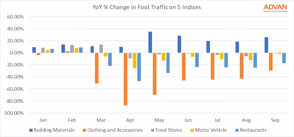 Our foot traffic indices capture trends that show just how varied the path has been. We looked at the percentage change in foot traffic for 5 different sectors during each month of this year.