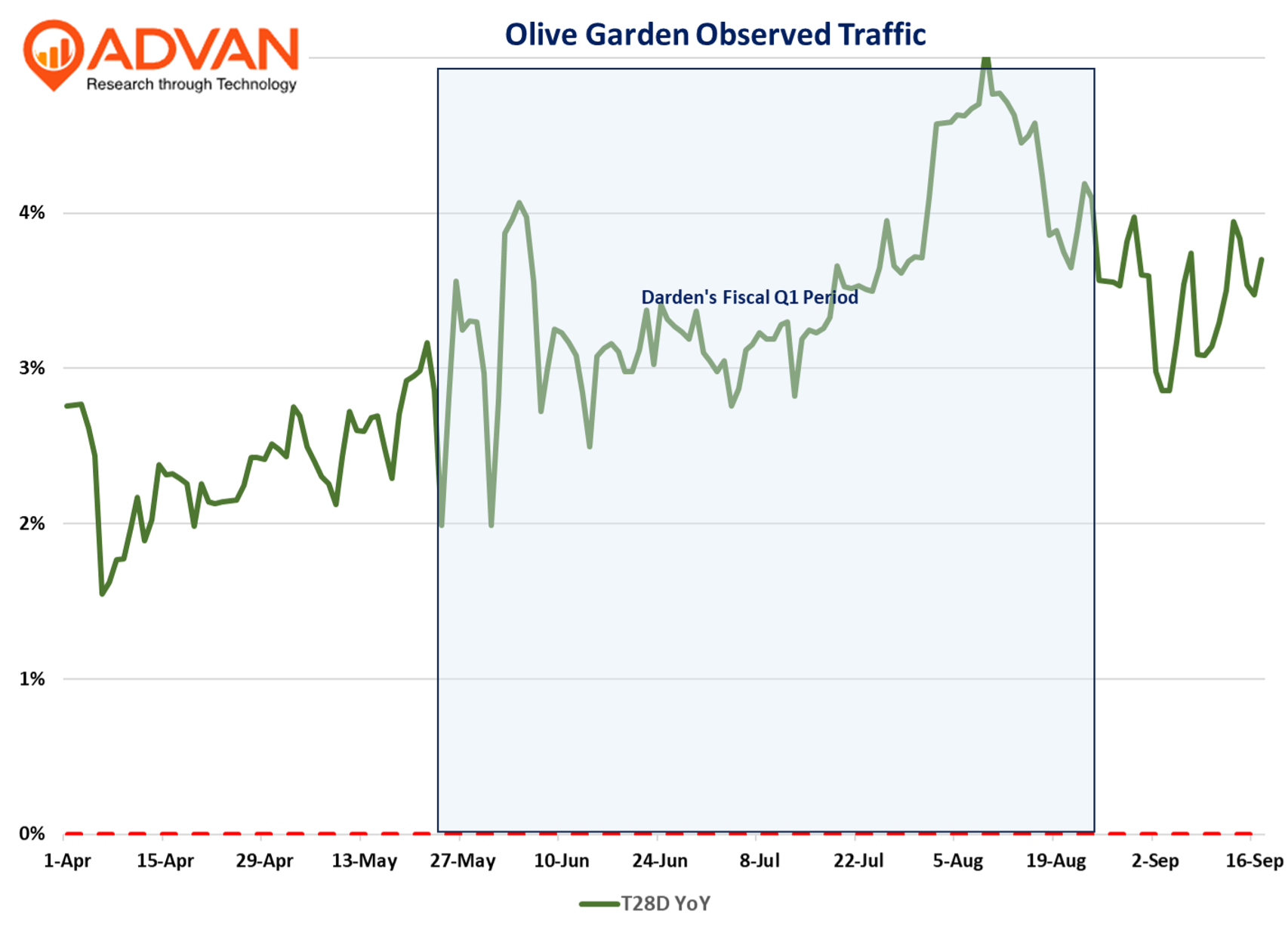 Traffic slightly built into quarter-end, and has remained at a high level thus far in September. The ongoing strength likely emboldened management to raise its full-year comp-sales outlook by +50bps to approximately 3%. For CQ2, Advan also shows Olive Garden’s dwell time and visit frequency increasing YoY. Olive Garden’s profits at 20.5% were roughly even YoY, despite investments in affordability (pricing less than expense inflation) – more on that in a minute. That favorable margin dynamic in a difficult cost environment reflects its strong top-line growth. On its success in gaining share-of-spend and -stomach, CEO Rick Cardenes said, “[Our] restaurant teams remain focused on being brilliant with the basics through culinary innovation and execution, attentive service and an engaging atmosphere…”