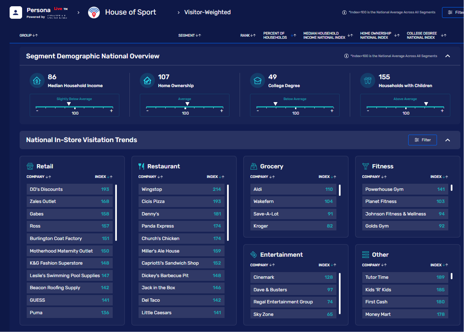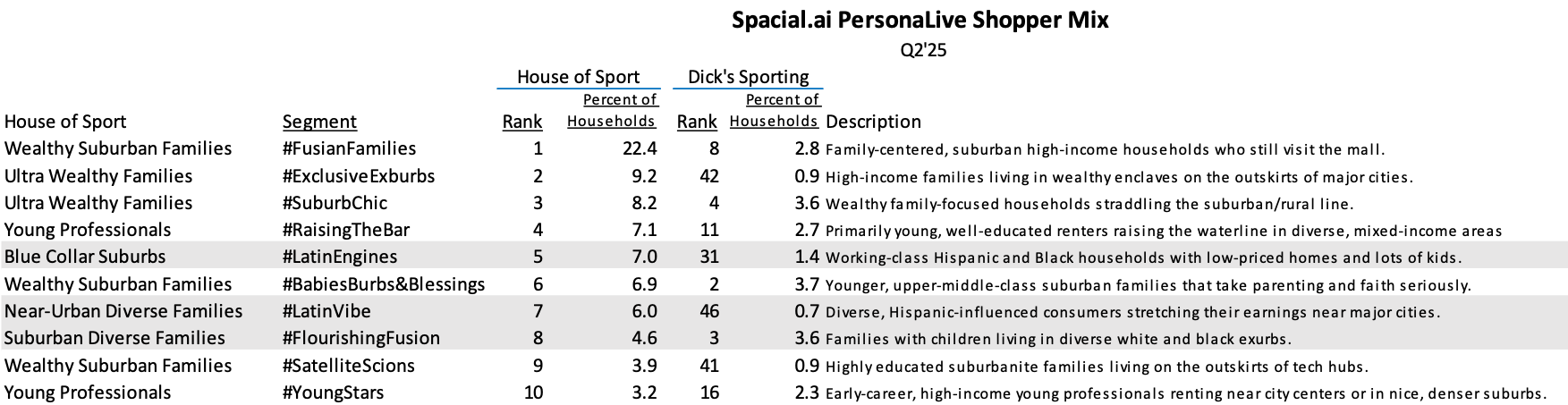 Looking at Advan’s data, the House of Sport continues to bring in more than 60% visitors than the average Dick’s location and 47% more visits, which is up 170bps YoY. Moreover, those improvements are happening on a large number of locations and the smaller markets as Gupta shared. The table below shows who’s shopping the House of Sport vs. a traditional Dick’s Sporting Goods location is demonstrated in the chart below. We expected a more idiosyncratic mix for House of Sport given the massively fewer number of locations. We also expected that high-affluence segments would be weightier as the table does demonstrate. However, we are surprised by the high weighting for ethnic segments, something that may have influenced management in their decision to acquire Foot Locker. For example, LatinEngines is its #5 segment vs #31 for Dick’s (out of 80 segments). We show the full LatinEngines description below. Maybe House of Sport has found a formula (or routine) to pull an outsized amount of spending from these segments, i.e. a superior way of catering to their needs, with the plan now to deploy some of that formula to Foot Locker’s 670 US locations and Champs 380 US locations.
