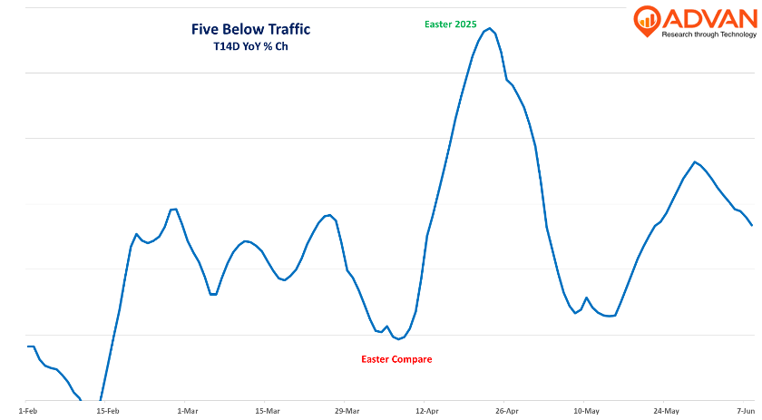 On Five Below’s quarterly cadence, Park said, “February, we had bad weather throughout the country, which definitely impacted traffic in comp. And then we have a shift in Easter timing. We consider March and April together in terms of a year-on-year comparison. But again, coming out of the holiday, we have continued to see nice growth.” Those trends match what we see in Advan’s data, as shown below. As we move into the Summer seasonal holidays and the 2H’s, we expect to see even more comp improvement as Temu and Shein are not distorting advertising and consumer spend. The same is true for the other impacted brands as well.