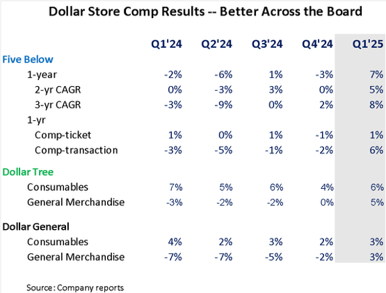 Back to Five Below, and its results and comments. CEO Park said, “What differentiated this past quarter was our heightened focus on the customer and working as a tight-knit multidisciplinary team from merchandising, planning and allocations to marketing, store operations and supply chain. We made great strides on one, sourcing amazing product focused on Easter, spring break, trend-right beauty, novelty, food and candy as well as relevant cultural Five Guys moments like Minecraft [and Lilo & Stitch]; two, amplifying these products with end-to-end storytelling that started with social media through to compelling in-store floor sets; three, ensuring better in-stock positions with tight alignment between our teams at WowTown, our ship centers and the store fleet; and four, continuing to benefit from investment in labor hours and operating efficiencies….” And so, there is the call-out on the amplification of its social media increased working efficiency (i.e. less Temu), combined with opportunities from box office hits, better in-stocks, and improved store standards and service levels, i.e. retail fundamentals and “back to basics” as is the improvement program at Dollar General and Dollar Tree. That improved execution shows up in Five Below’s improved traffic, conversion rate, dwell time, and basket size. The increased dwell time reflects the higher basket size. Advan’s data shows that the improved conversion rate increased comp-transactions at a 400-500 bps faster rate than comp-traffic.