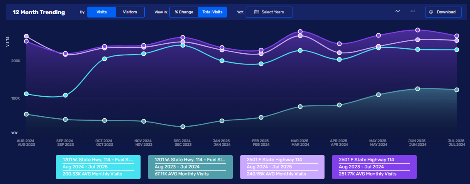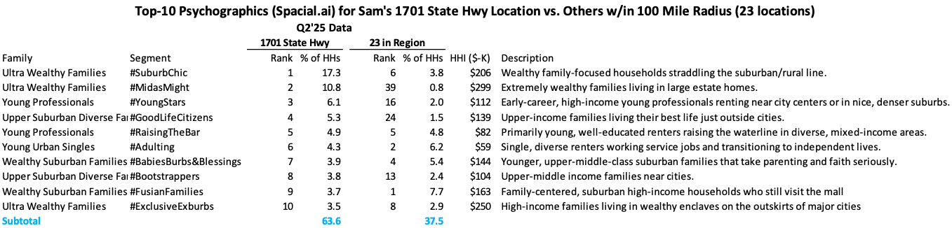 Last fall, Sam’s opened its new club format in Grapevine (1701 W State Hwy 114), which doesn’t have traditional checkout POS; it’s solely Scan-&-Go (vs. approx. 40% of transactions chainwide). The location also has twice the number of curbside spots (32) of a typical club location. As shown in the chart below, Grapevine does 12% more traffic than the average of the 23 Sam’s in the region (100 mile radius). Due to the Scan-&-Go, its dwell time is 4% less than the region’s average. The Grapevine location has a more-affluent customer than the average; it's median HHI / percent-of-households with >$125K in HHI is $142K / 46% vs. $102K / 28% regional average. (Remember that as the affluent out-spend the average, their contribution to the location’s sales will be far larger than these %-figures.) Looking at the differences one layer deeper is shown in the following table of top-10 clusters out of Spacial.ai’s 80 clusters. This location’s customer mix is very idiosyncratic to the other Sam’s in the regions, and its shopper mix is far more similar to the nearby Costco (2601 W State Hwy 114). The third figure below shows this Costco’s monthly visits over the past year (light purple), to the base period (dark purple), and since the Sam’s opening, it’s been down each month with the gap widening. Prior to the opening, the Costco was consistently up YoY. In Q3’24, 32% of this Costco’s visitors also visited the Sam’s; by Q2’25, this had increased to 50%. That’s a lot of competitive encroachment and it implies a lot of wallet share capture by Sam’s. Sam’s just opened another one of these clubs in Tempe, AZ, with more to follow. There isn’t a nearby Costco to the opening, but Target is nearby.