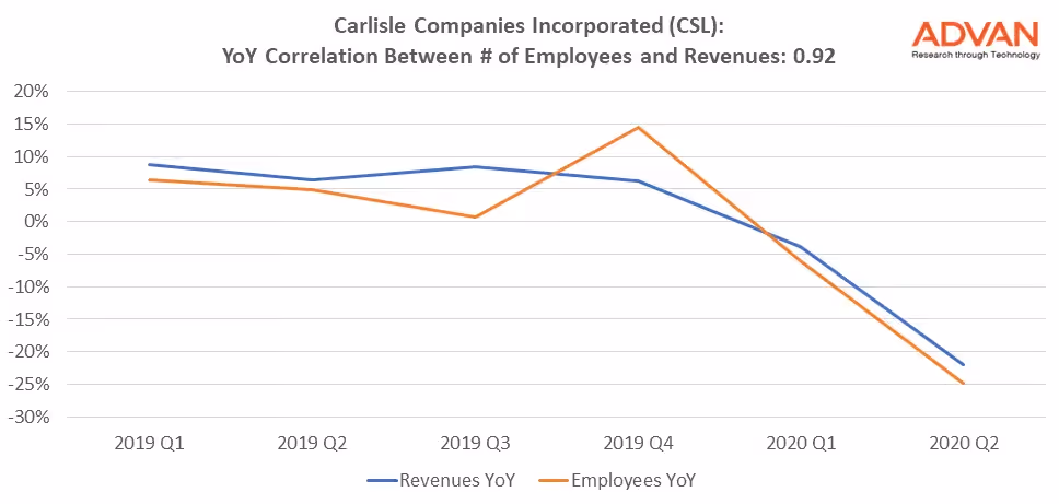 As an example, we looked at Carlisle Companies (NYSE:CSL), a $7 billion market cap manu-facturer of engineered products. As the chart below shows, we found a 0.92 correlation on a year-over-year basis between the number of employees at Carlisle’s facilities and the company’s top line revenue.