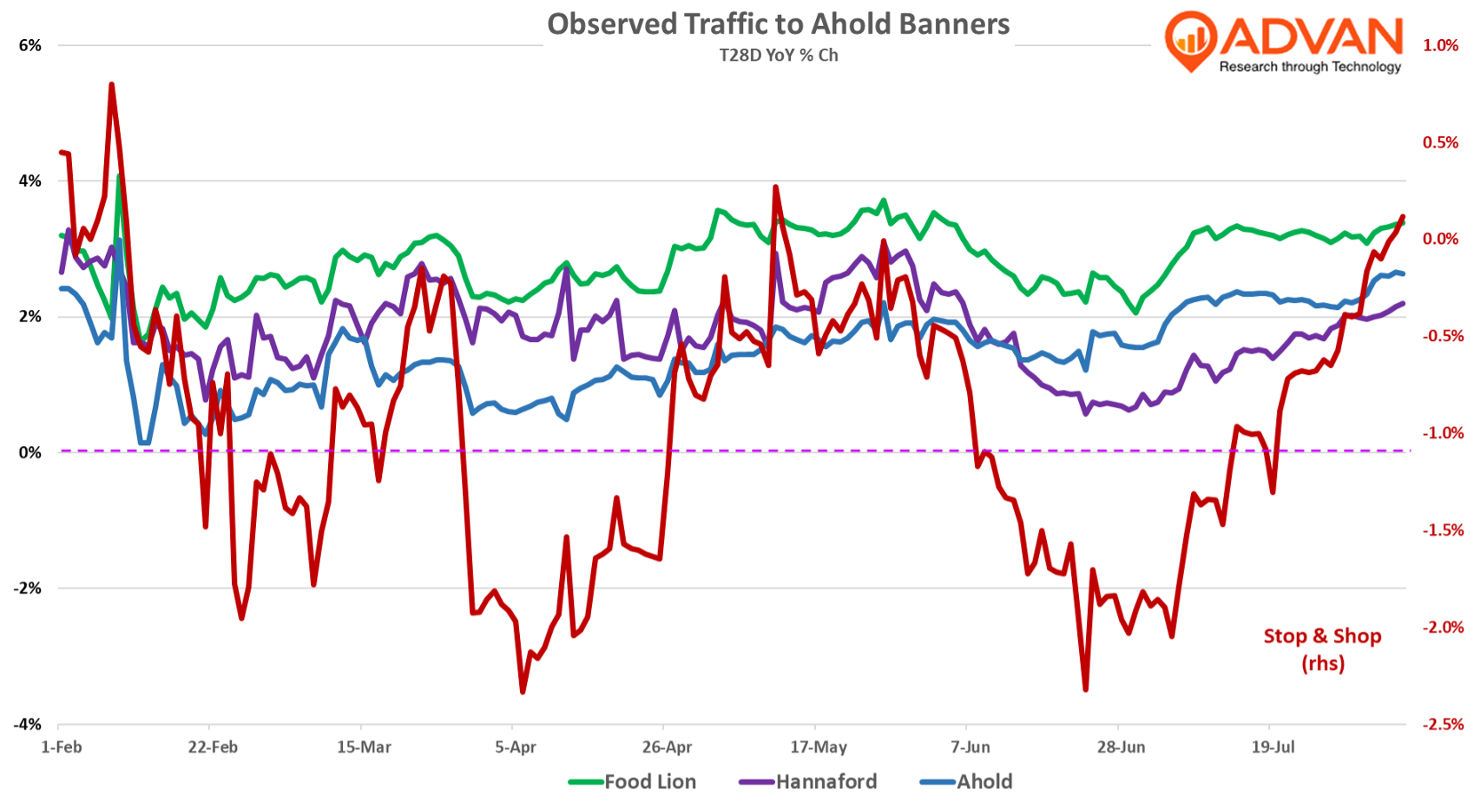 As the chart below demonstrates, Food Lion and Hannaford are driving outperformance in Ahold’s brand portfolio; for Food Lion both frequency of visit and dwell time increased YoY. (The increase in dwell time implies an increase in UPT.) By contrast, Stop & Shop remains volatile and an anchor; its visit decline is the result of fewer visitors, i.e. it is being dropped from consideration and peoples’ routines. Muller, “It has been one year since we announced decisive and deliberate actions to ensure a stable and thriving future for the brand. And since the announcement, we have closed 32 underperforming stores, started price investments with regularly recalibrating based on customer response, continued store models focusing on a more efficient use of capital and a broader store reach, improved store execution and on-shelf availability and deployed communication tactics to maximize customer awareness and emphasize own brands. We are encouraged by customers' response to the initiatives, which we have implemented so far. And where we have made investments, we are attracting new customers, seeing increased volumes and seeing an improved Net Promoter Score. While we are celebrating the wins, we continue to focus on executing the plan, driving sales and finding sustainable and substantial efficiencies. This includes a strong focus on supply chain optimization as well as maximizing promotional effectiveness. In the second half of the year, we will expand our price investments to additional markets, further optimize our assortment and continue our store remodels.”