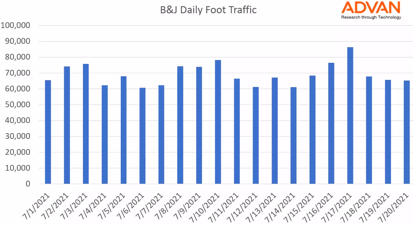 Looking at the recent foot traffic across all 380 Ben & Jerry’s stores that Advan Research covers, there does not seem to be a material effect on customer visits. The chart below shows the daily traffic for every day in July: