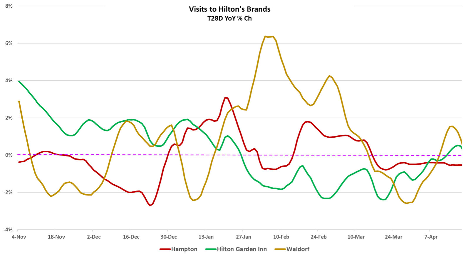 Given the recent news from the airlines that bookings were dropping and the deceleration in longer-term visits to Hilton’s brands as shown in Advan, it wasn’t surprising to hear Hilton cut guidance for the year. CEO Chris Nassetta said, “We reported system-wide RevPAR growth of 2.5% year-over-year, driven by strong momentum from the end of last year that carried into 2025 and supported solid performance in both January and February. However, broader macro uncertainty intensified in March, which pressured demand, particularly across leisure… Weaker trends have continued into the second quarter, with short-term bookings roughly flat year-over-year. We believe travelers are largely in a wait-and-see mode as the rapidly changing macro environment continues to unfold. …For the full-year, our system-wide RevPAR expectations are flat to up 2%, with the midpoint assuming current trends continue.” (Which is down from the prior +2-3%.) As can be seen below, these monthly and brand dynamics are clearly visible with Hampton and Hilton Gardeen inn settling in lower YoY; we’d characterize it as a “measured slowdown” as apposed to anything dramatic or abrupt. Obviously, slower demand leads to lower room rate prices and that feeds into the RevPAR. (RevPAR is revenue per available room.) Waldorf’s visitation is more affected by drinking and dining visits than the other two brands – thus the higher volatility.