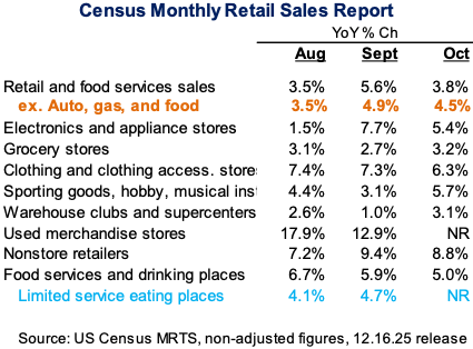 The October monthly retail sales from Census report (today) reinforces that trends that have been underway all year continue, i.e. no new trends or inflections shown in the report.