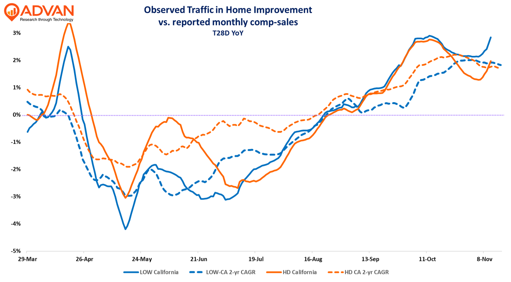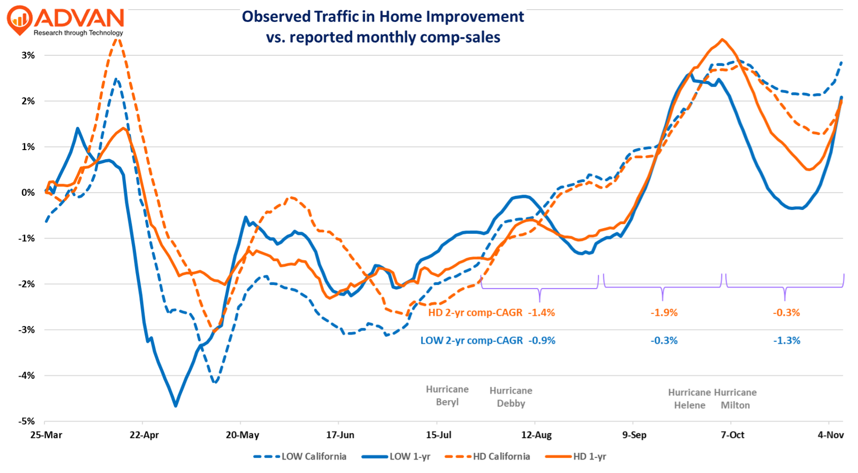 To untangle the storm noise from the underlying trend, we created the two charts below, which compare trends on a 1- and 2-yr basis and the nationwide to California (thankfully no hurricanes). Notable for the period, there were four major hurricanes in FQ3’24 and versus none in ’25; as such, this was an idiosyncratic quarter and a poor read on the health of the home improvement market. The first chart shows the nationwide traffic levels being pulled higher than California due to an easy comp to the disruption from the storms, followed by a deep deceleration due to comping cleanup activities. The second chart, just California, shows a clear improvement in the traffic trend since mid-August, with Home Depot slightly leading on a 2-year basis. Lowe’s management noted being pleased with the performance of its West division.