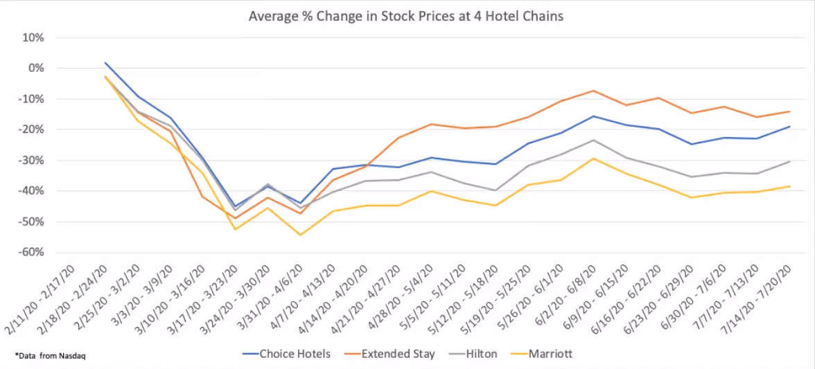 From the second week of February all four of the chains we analyzed saw a steep and prolonged fall in stock price through to the first week of April, when they began to rebound. Extended Stay America in particular has experienced a healthy share price recovery, with its stock back to only 10% below where it was in February, which is worse than S&P’s 0.9% gain but better than its competitors; Marriott’s share price is still 40% lower than it was pre-COVID and Hilton’s hovering around -30%.