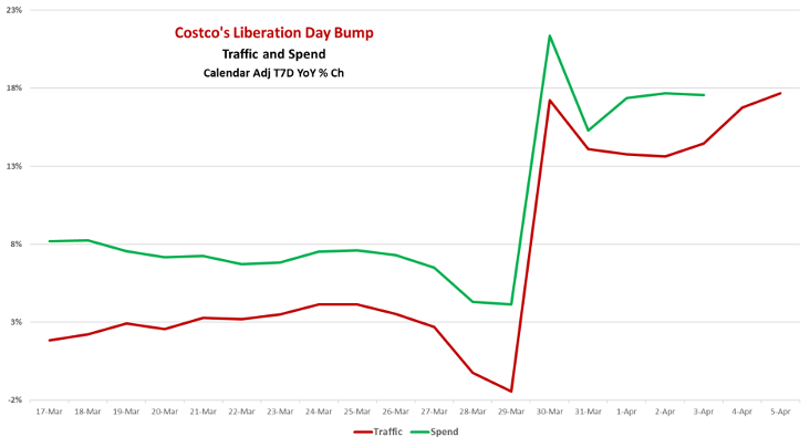 Looking forward, we expect there to be a near-term surge in traffic and demand by more affluent households to purchase discretionary goods ahead of higher prices, as we saw in new car sales in March. US consumers are savvy, and as such, they move fast to secure bargains; Advan sees that readily in Costco’s trends. Traffic and spend spiked the weekend before Liberation Day, as shown in the chart below. We see a similar trend at Sam’s Club, a much bigger lift at RH, and a smaller bump for Target. That makes sense as the higher the affluence of the brand’s customer base, the more that they can afford to buy ahead of price increases. However, this is a pull-forward and as we move into the 2H of April, we’d expect to see notable drops in activity. Obviously, the May and June periods are going to be critical months to observe where things are settling; more on that in May.