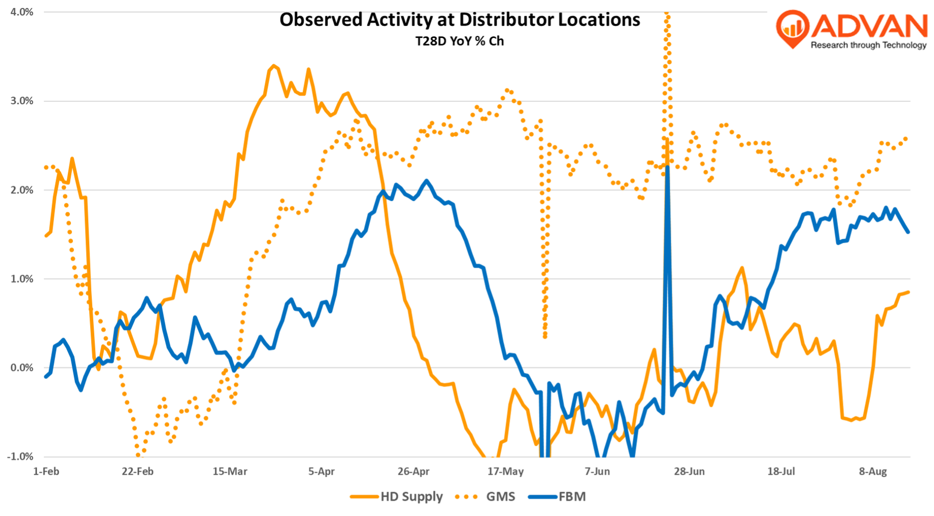 Overserved activity (Advan) at the distributor locations of the three, suggests that GMS has more business momentum this year and that HD Supply and FBM were more impacted by tariff inventory and order adjustments. That said GMS organic revenue was down -8.3% in CQ2 and so we know that revenue is more volatile than activity. In June, GMS’ CEO said, “We are cautiously optimistic that we are nearing the bottom of the cycle, although the intensity and duration of the downturn will vary by each market. [Q2] demand was down across both residential and commercial as economic uncertainty dominated the headlines.” However, as we demonstrated earlier, wallboard activity picked up over the summer as shown by producer Eagle Materials. And so, there is a turn up happening somewhere out there – Home Depot and Lowe’s both see it coming.