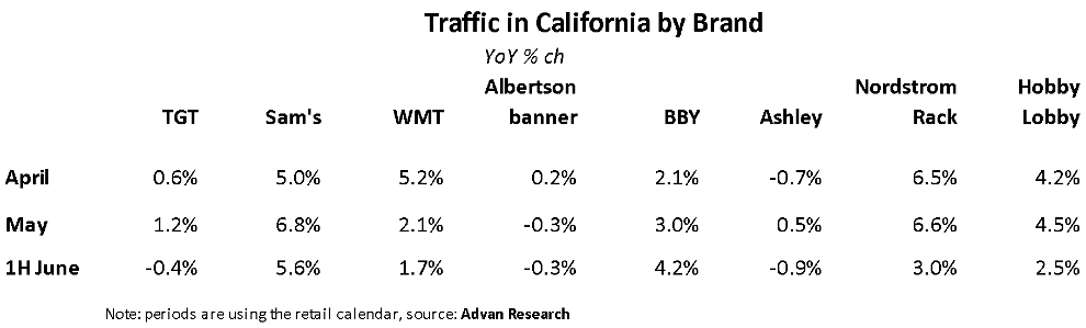 To isolate the underlying consumer trend from the horrid weather, we looked at traffic in California for Target, Walmart, etc. as shown below. What sticks out to us is the deceleration by Walmart (which roughly matches the sector’s -250bps MoM deceleration in the Census report). The pull-forward benefit to Walmart was very clear as the February – April average trend was +1.9%, before a mid-April spike that took the level up to +8.2% (on a trailing-14-day basis). That Best Buy accelerated is surprising; the further improvement in June likely reflects the release of the Nintendo Switch. In our opinion, the robust trend for Rack and Hobby Lobby reflects “less Temu.” By contrast, the worsening trend for Albertson’s likely reflects share-of-stomach loss to club, mass, and value. The loss is an industry trend, as we see similar trends for Ralphs and Safeway. (See our report on the topic here.)
