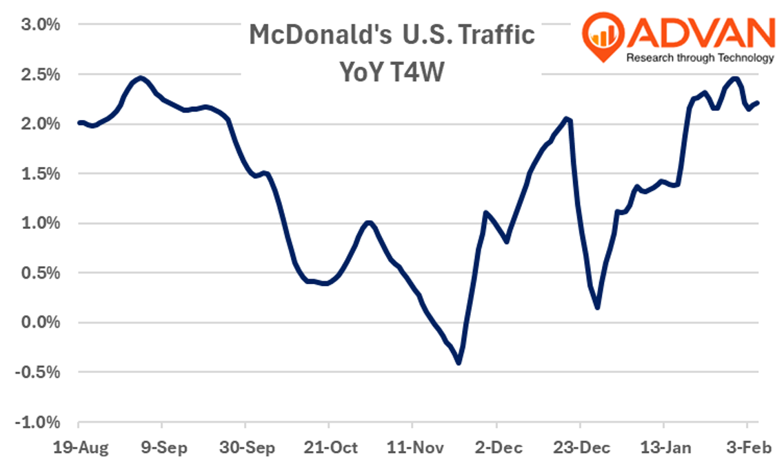 As traffic data and intra-quarter commentary indicated, U.S. comp-sales deteriorated QoQ by -110bps for a -1.4% decline for Q4. Advan Research data showed a -136bps deterioration in traffic and -115bps in spend*. However, since the E. coli scare in October, the traffic and sales trend has improved as shown in the chart above. CEO Kris Kempczinski stated, “The U.S. food safety issue is now largely behind us, and we expect to have fully recovered by the beginning of Q2. At McDonald's, we always say that food safety is our #1 priority, and [the E. coli outbreak was an] unfortunate incident... The strength of our brand depends upon the absolute trust of our customers, and I'm pleased by the positive feedback we've received from so many regarding our rapid and transparent handling of this issue…”