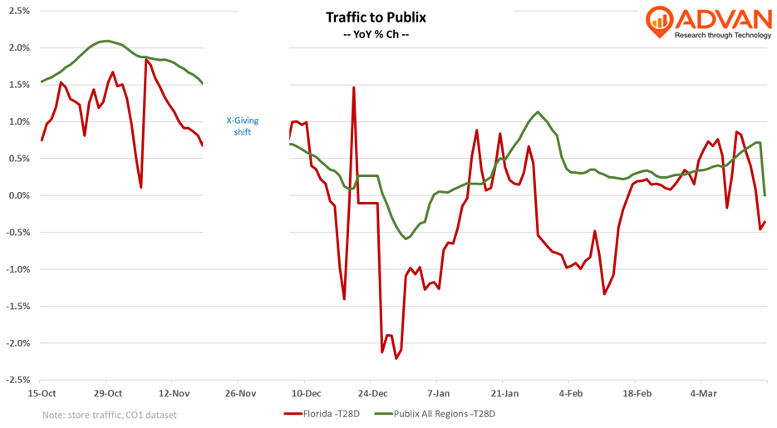 For calendar Q4, Publix reported a +4.1% increase in comp-sales and a +4.8% increase in profits. However, the quarter, like the prior, was noisy due to the hurricanes. If we adjust for the storms and inflation, the sales increase was around +2.7%. Advan estimates that comp-traffic increased +1.0%, which would put the comp-ticket at +1.7% and that’s likely from the sale of high-priced GLP-1 perscriptions and some inflation. (Advan’s data shows average ticket increasing +1.1%, or roughly aligned.) Excluding inflation, basket size or units-per-transaction (UPTs) would be up slightly. For Q3, Advan estimates that comp-traffic increased +2.3% in Q3 and a slight increase in UPTs. And so, both traffic and UPTs were healthy for Q4 and roughly at the same level as Q3 when adjusting for the the storms and the shortened holiday period.