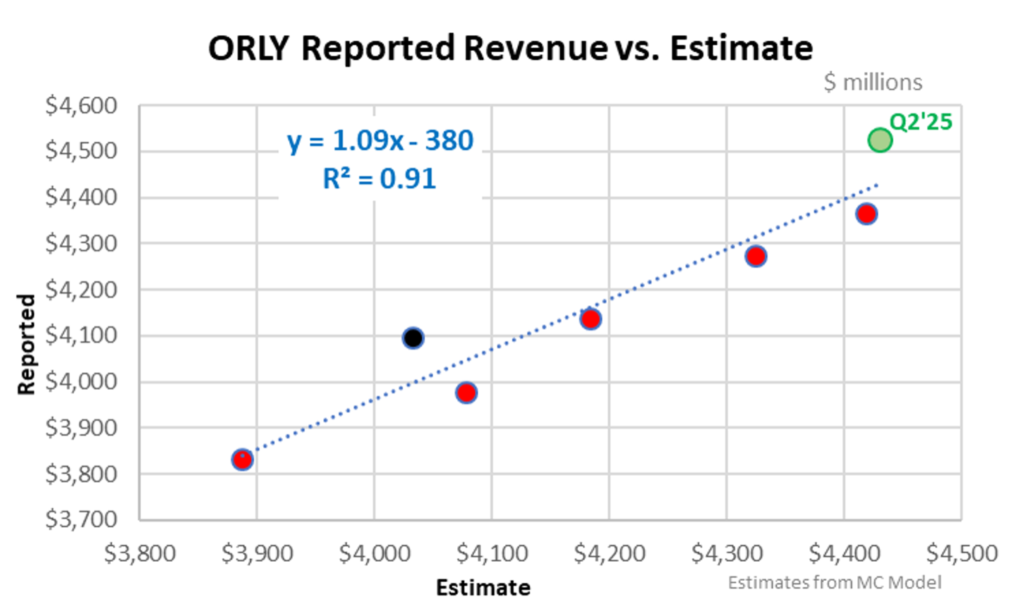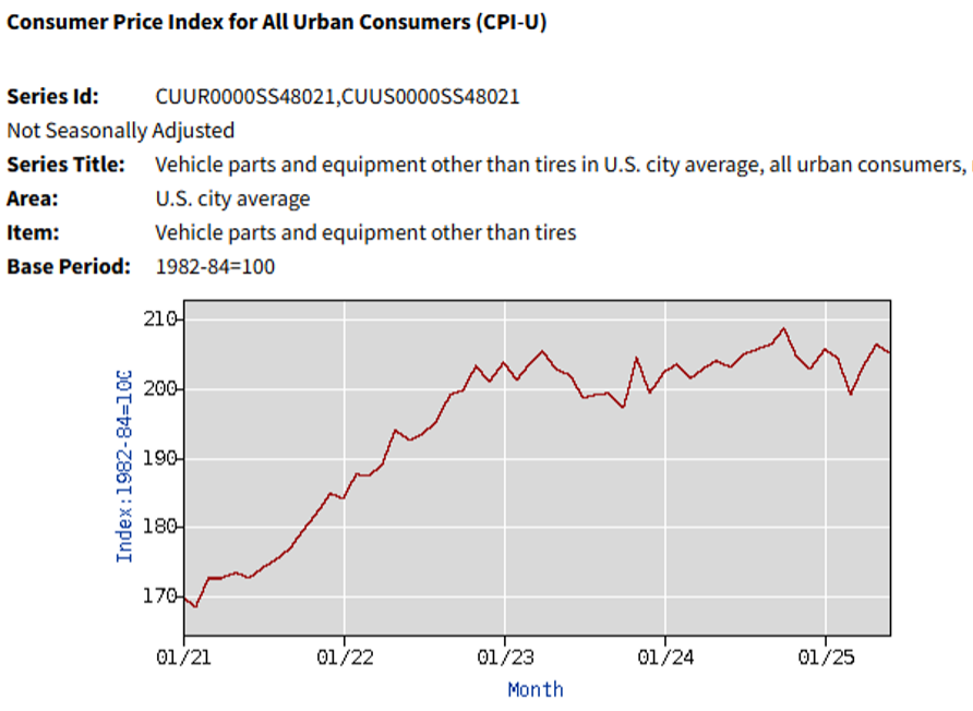 Auto part retail, and specifically, O’Reilly (ORLY), Advance (AAP), and NAPA (GPC), are interesting businesses from an alternative data estimate perspective given that commercial (or DIFM) is half of the industry’s revenue and that’s billed business vs. POS / credit card. (For NAPA it’s nearly 80%.) Mobility data captures both -- the DIY visit to the store and the store’s delivery truck leaving the store to deliver parts to a repair shops. That said, there are discrepancies / error in the estimate that stem from spurts in inflation and much stronger DIFM sales relative to DIY. Abnormal weather can also increase the error. The chart below shows ORLY reported revenue to estimated* revenue; the average error over the past 8 quarters is +/-1.6%, i.e. pretty darn good. For Q2, reported revenue was 2.1% above our estimate with the overage stemming from the above factors. Specifically, same-SKU ticket inflation accelerated from +0.5% to +1.5% due to tariff cost pass-through, thus explaining 100 bps of the 2.1%. Additionally, DIFM comp-sales were over +7%, vastly stronger than DIY comps of +1%. As the DIFM comp-ticket is far larger than the DIY comp-ticket, this mix impact increases the overall comp-ticket and revenue, thus explaining the remaining 110 bps under estimate. The chart's red dots... Generally, these were quarters where the weather was disruptive and the inflationary surge of 2022 rapidly mellowed in ’23, then picked up again, as shown in the second chart below. The black dot was Q4’24 – a very strong quarter on both the DIY- and DIFM-side.