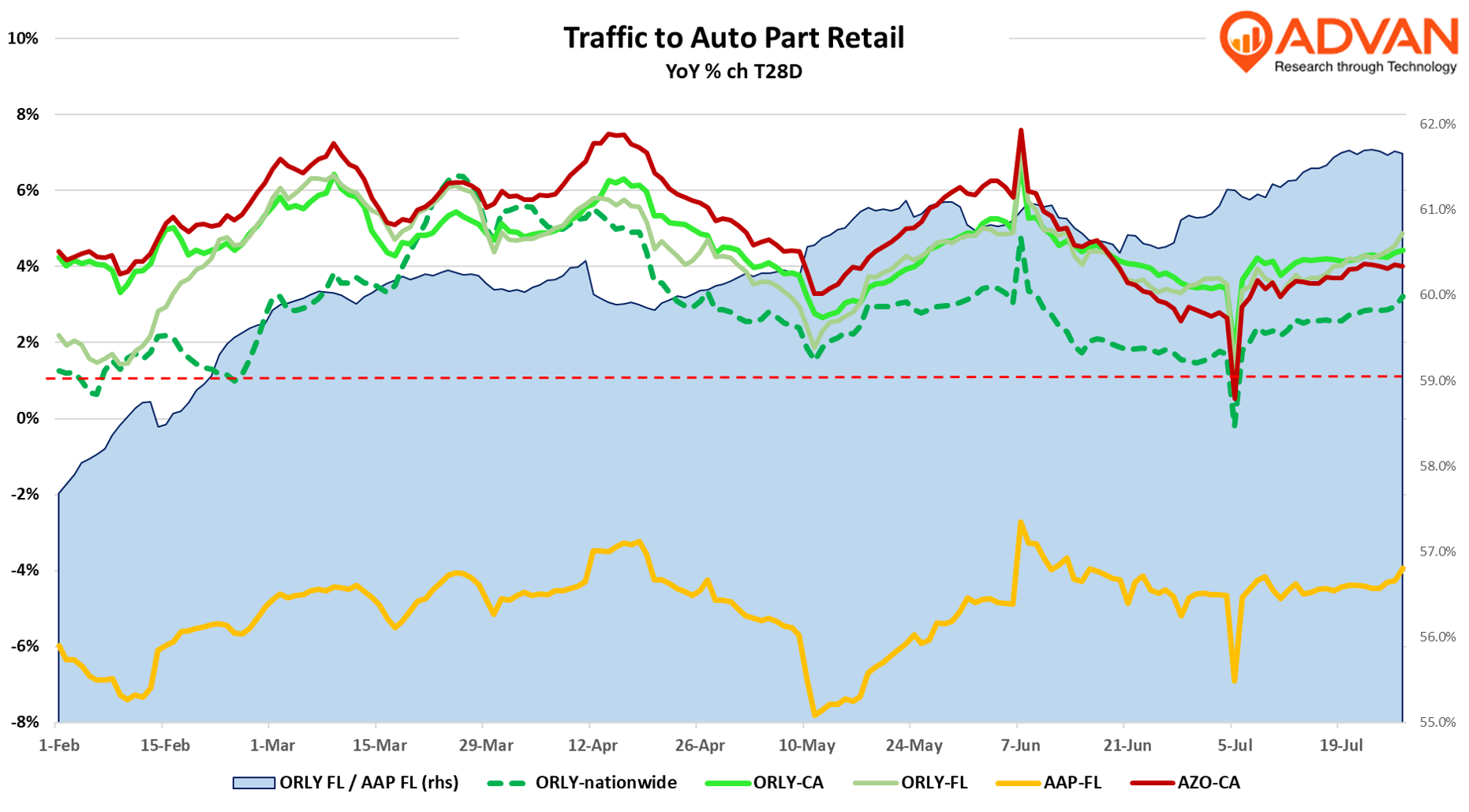 Back to ORLY’s Q2 results, the DIFM comp of +7% was spectacular and that reflects a healthy overall market (i.e. more miles driven and an ageing vehicle population, including of high value / well-maintained vehicles). It also reflects ample market share capture. Recall that Advance Auto exited the West in order to solidify its hold on the Southeast and northward. Florida is Advance’s largest state with 526 stores. O’Reilly is much smaller in Florida at only 313 stores. However, as shown in the below chart, O’Reilly is getting larger in Florida, whereas Advance is getting smaller. The blue patch in the chart is O’Reilly’s T28D visits relative to Advance in Florida. At the end of January, the ratio was 57.7% and by mid-July, the ratio has risen to 61.7%, i.e. Advance is getting swamped. Over the past year, O’Reilly has added 30 net new locations in Florida. Assuming company-average new store productivity, that implies that O’Reilly’s Florida business is up both on a comp-basis and from new locations.
