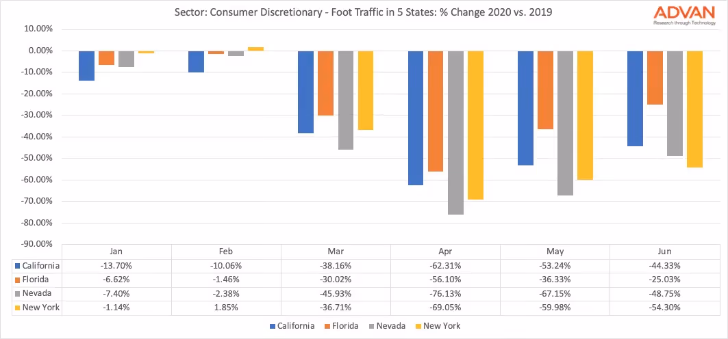Looking at June, there are very clear signs that consumers are back in stores. New York still lags. But in Florida foot traffic is now only down 25% compared with this time last year. Heading into July, with a new outbreak of cases in the state, we will see whether the trend continues.