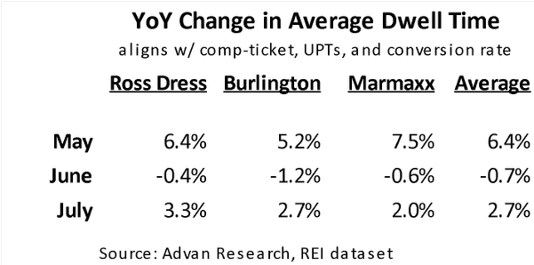 In the off-price segment, after an unusually slow June, things picked up nicely in July and early August. We are still puzzled by June, and so that’s what we hope to learn about when results are reported in the next couple of weeks. Our hypothesis is that the month was hindered by less new merchandise flow and lower in-stocks due to transitory factors stemming from “tariff discombobulation,” with Ross Dress for Less most impacted. Supportive of this hypothesis is the decline in dwell time for June across all three companies. Less dwell time results in a lower conversion rate and fewer items in the basket (UPT).