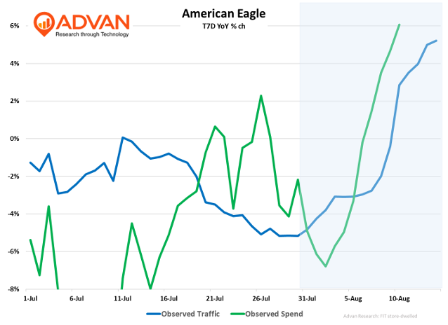 By contrast, there was no improvement in Old Navy’s traffic, which was down low-single-digits. There’s been a lot of interest in what we are observing at American Eagle from the Sydney Sweeney campaign. As shown, since the campaign “went viral” (July 31st), the traffic and spend trend have firmed up from the trend prior to the campaign drop on July 23rd. However, ahead of the campaign, American Eagle likely held back on marketing and promotional campaigns, which would have dampened that period’s trend. Additionally, we’d expect any “reaction” to be experienced more prominently on its website than foot traffic to stores, as that channel is more reflexive. Other data sets observe a 50%+ lift to site traffic after the 27th, thus affirming our suspicion on channel dynamics.