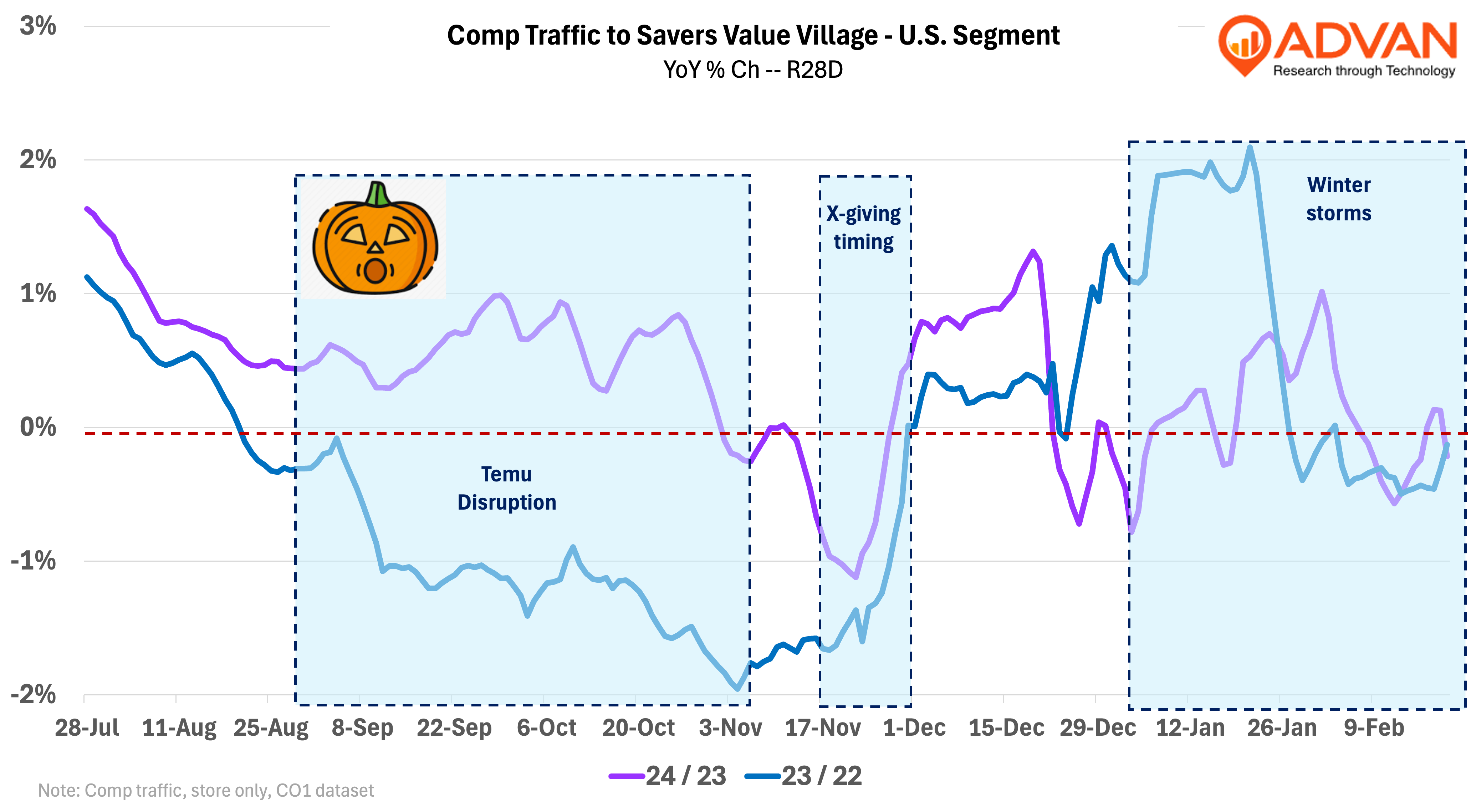 Savers Q4 results showed US sales up +10.5% and comp-sales up +4.7%. The sales increase was ahead of Advan’s +8.2% estimate* (+/- 40 bps T4Q Moe, 95% T5Q correlation). The 230 bps of outperformance largely reflects a +580 bps contribution from the bolus of new stores opening in the 2H (vs. the 6-month trend of 390 bps). (The year-end U.S. store count was up +11.6% vs the 1H’s +8.6%.) Unfortunately for the company, its large Canadian business continues to be an anchor with comp-sales down -2.5% and segment profits down nearly -20%. (Canada was nearly equal to the US segment’s profits in 2023 at $190m. For 2024, it produced only $165m in profits and 2025 will also see a meaningful decline from there.) In terms of the outlook, management was constructive on the U.S. segment, but very guarded on the Canadian business. The Canadian consumer is under duress and has disengaged from spending on home and apparel; moreover, the tariffs and even the threat of them are going to worsen the pullback.
